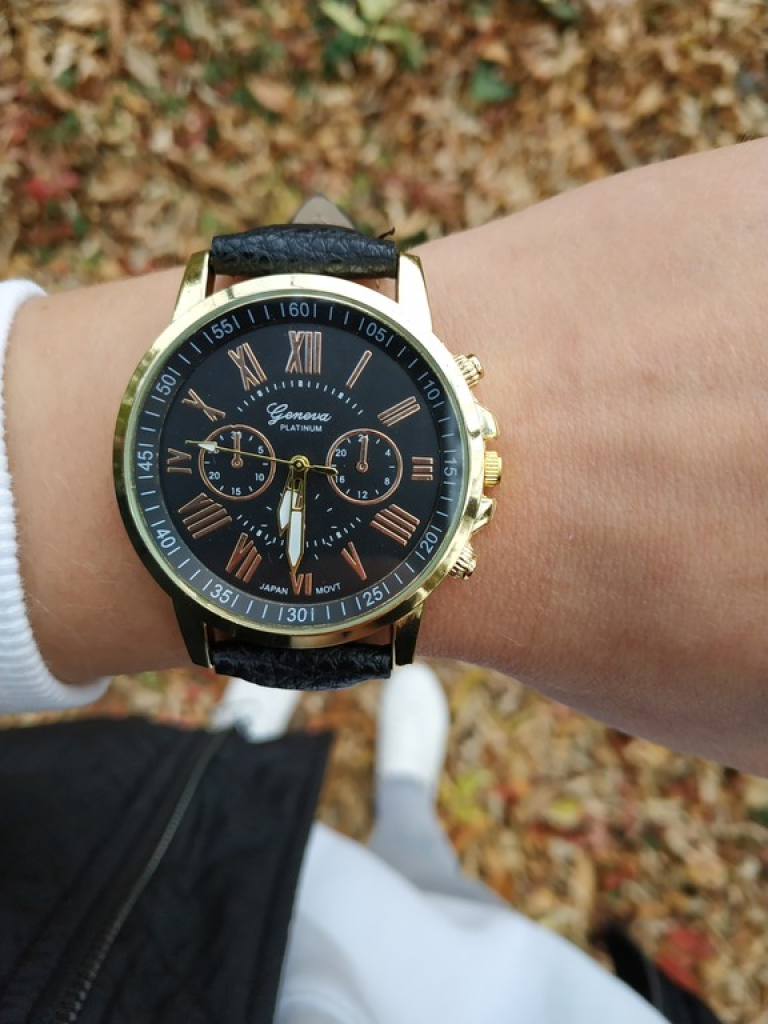 Колір чорний.Фурнітура – золото.Розмір циферблату 4 см.Ремінець – еко-шкіра.Модний жіночий годинник з фактурним чорним браслетом чудово підійде для створення повсякденного елегантного образу. Ремінець складається з двох шарів - зовнішній фактурний із щільної штучної шкіри та внутрішній гладкий. Прошивка по краях забезпечує довговічність, запобігає швидкому стирання матеріалу. Масивний циферблат чорного кольору з відмітками у вигляді римських чисел, логотип Geneva. Стрілки великі, білого кольору із золотою окантовкою. Оформлення золотого кольору, задня срібна кришка. Класична застібка у кольорі холодного срібла.Замовити та купити чорний жіночий наручний годинник із золотою фурнітурою недорого можна у нас. Швидко відправляємо до Києва, Харкова, Одеси, Івано-Франківська, Тернополя та по всій Україні.Більше відео на нашому каналі YouTube
