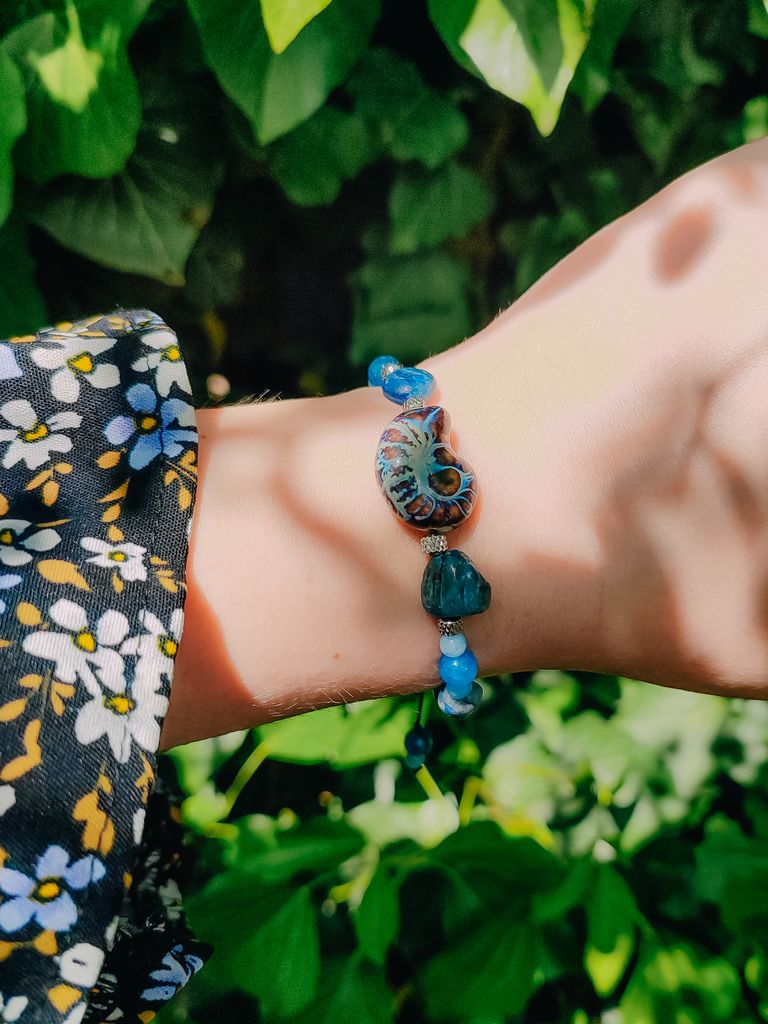 Блакитний браслет з натурального каміння — поєднання кіаніту, аквамарину та апатиту — створений для тих, хто шукає гармонію кольору, змісту й естетики. Кожен камінь має унікальну форму, а плавні переходи від ніжного блакитного до бірюзового відтінку змінюються залежно від освітлення, додаючи прикрасі живого характеру. Центральна деталь — авторська керамічна намистина у формі равлика — не лише акцент, а й символ внутрішнього руху, спокою і циклічності. Камені підібрані вручну, шліфовані так, щоб зберегти природну текстуру та енергію. Надійна основа зі зносостійкого шнура та фурнітура з нержавіючої сталі гарантують довговічність носіння. Регульований розмір робить браслет зручним для будь-якого зап’ястя.