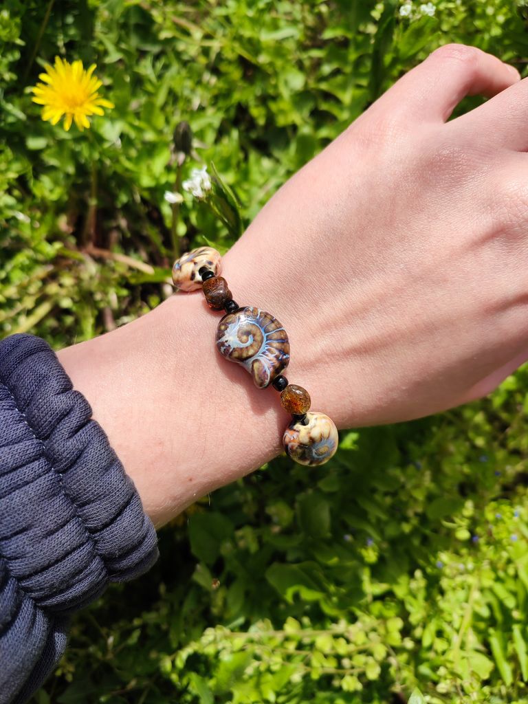 Браслет СКІФІЯ — прикраса з глибоким сенсом і характером, створена на перетині етнічної естетики й сучасного стилю. Натуральні матеріали — український бурштин з включеннями, димчастий раухтопаз і керамічні намистини ручної роботи — поєднуються у вишукану композицію в теплих тонах: коричневому, бежевому, золотистому. Центральна намистина у формі спіралі равлика — символ життєвого кола, безкінечного руху Всесвіту, а також натяк на зооморфні мотиви, властиві скіфській культурі.