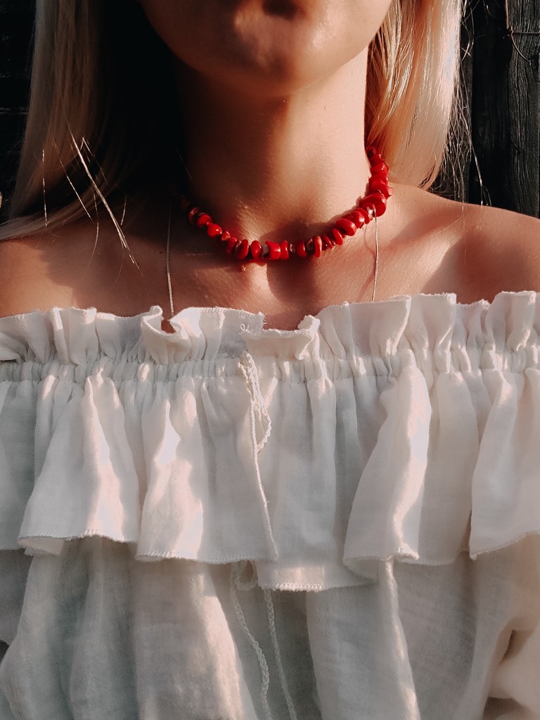 Мінімалістичне червоне коралове намисто з колекції українських прикрас "Сучасна українська автентика".