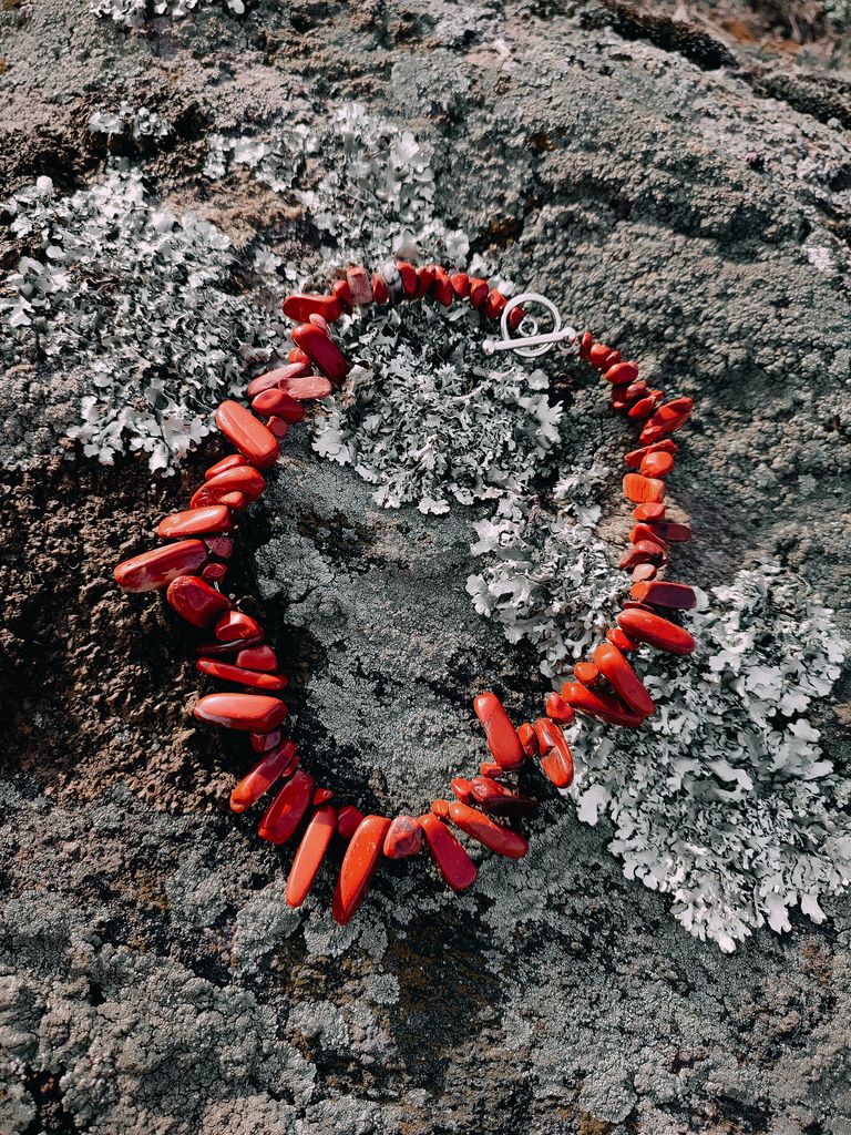 Стильне намисто на українську тематику у червоно-цегляному кольорі з натурального каменю яшми. Камені різної довжини, можна повертати у різні сторони, створюючи незвичний вигляд. Колекція прикрас ручної роботи "Сучасна українська автентика".