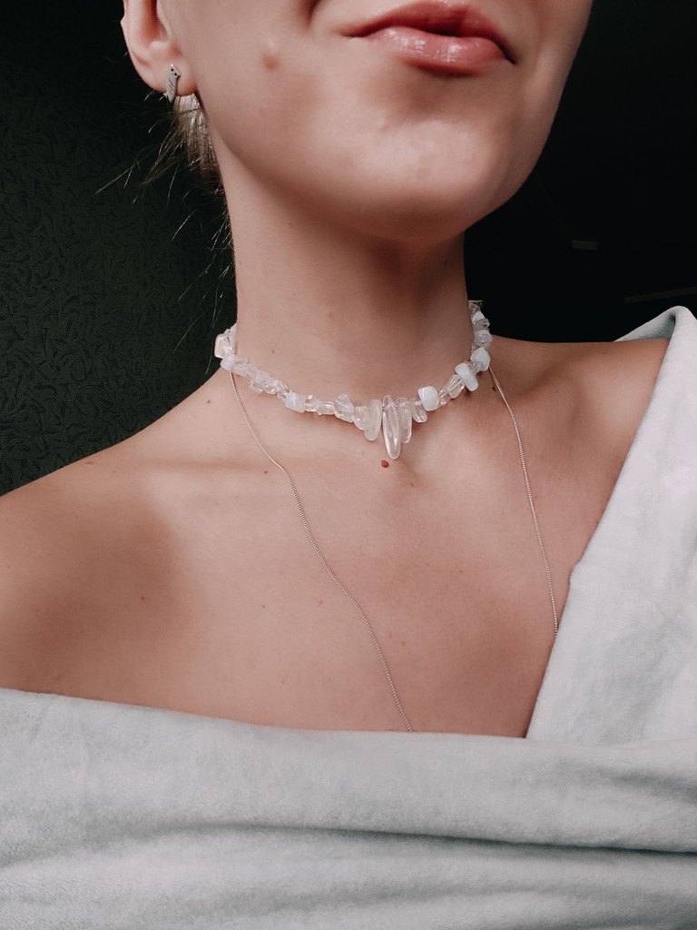 Витончене намисто чокер з прозорих каменів. Чокер виготовлений з місячного каменю (має голубий відтінок, проте переливається будь-якими барвами в залежності від освітлення). Гірський кришталь - прозорий.