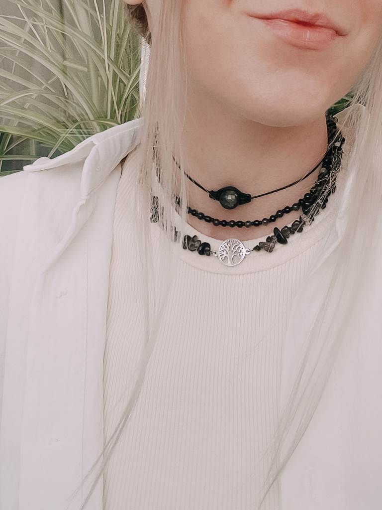 Обсидіан - камінь вулканічної природи, утворюється із застиглої лави. Плетіння чокера нагадує око. Чудовий варіант для повсякденного носіння з метою енергетичної взаємодії з мінералом.