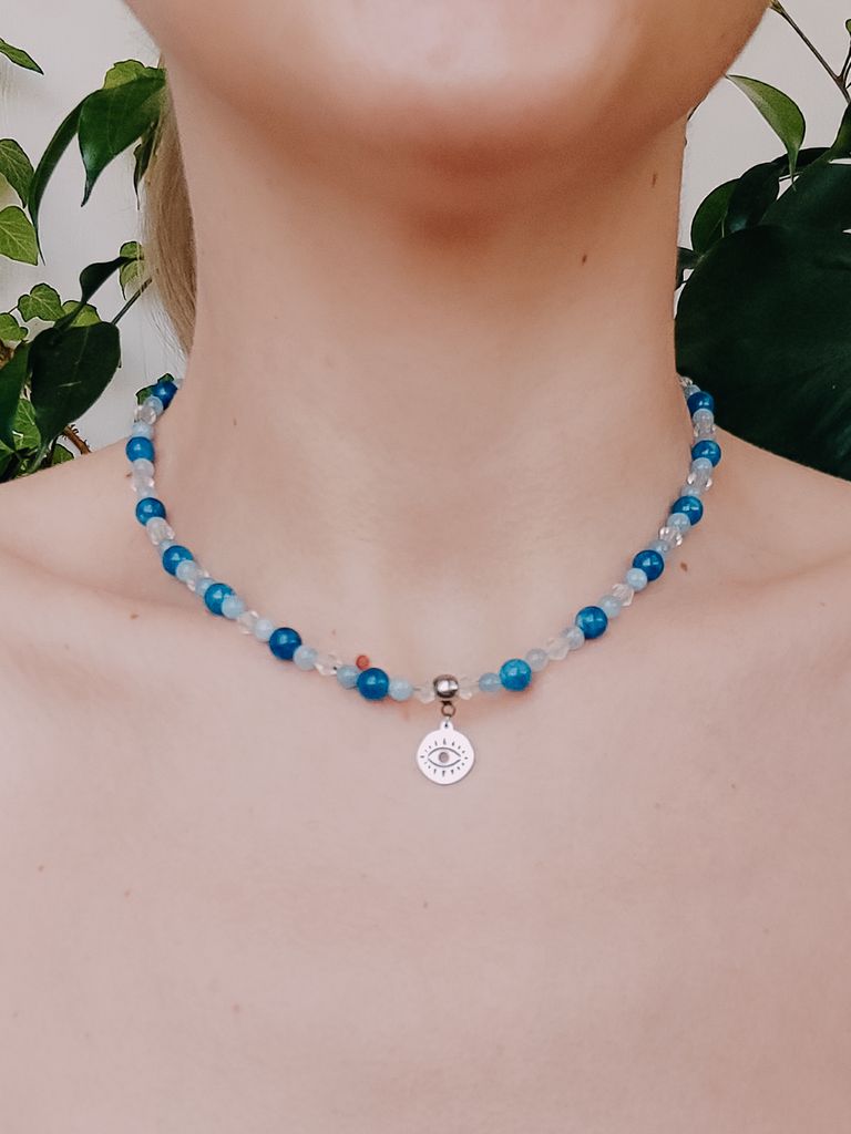 Блакитний чокер з аквамарину та апатиту з підвіскою у формі ока — прикраса з тонкою енергетикою та витонченим змістом. Натуральні камені підібрані так, щоб працювати у резонансі з Вішудхою (горловою чакрою) та Аджною (чакрою третього ока), посилюючи ясність думки та інтуїцію. Аквамарин надає цьому виробу морської прозорості та спокою, а апатит — глибини й інтелектуального пробудження. Центральна підвіска у вигляді ока додає чокеру символічності — вона втілює внутрішнє бачення та енергетичний захист. Камені злегка прозорі, а їхні відтінки переливаються в залежності від світла. Довжина регулюється — можна носити як щільно під шию, так і трохи нижче. Основа — трос зі сталі, фурнітура — гіпоалергенна та зносостійка. Чокер легко поєднується з іншими прикрасами. Можна додати браслет з цієї ж серії для цілісного образу.