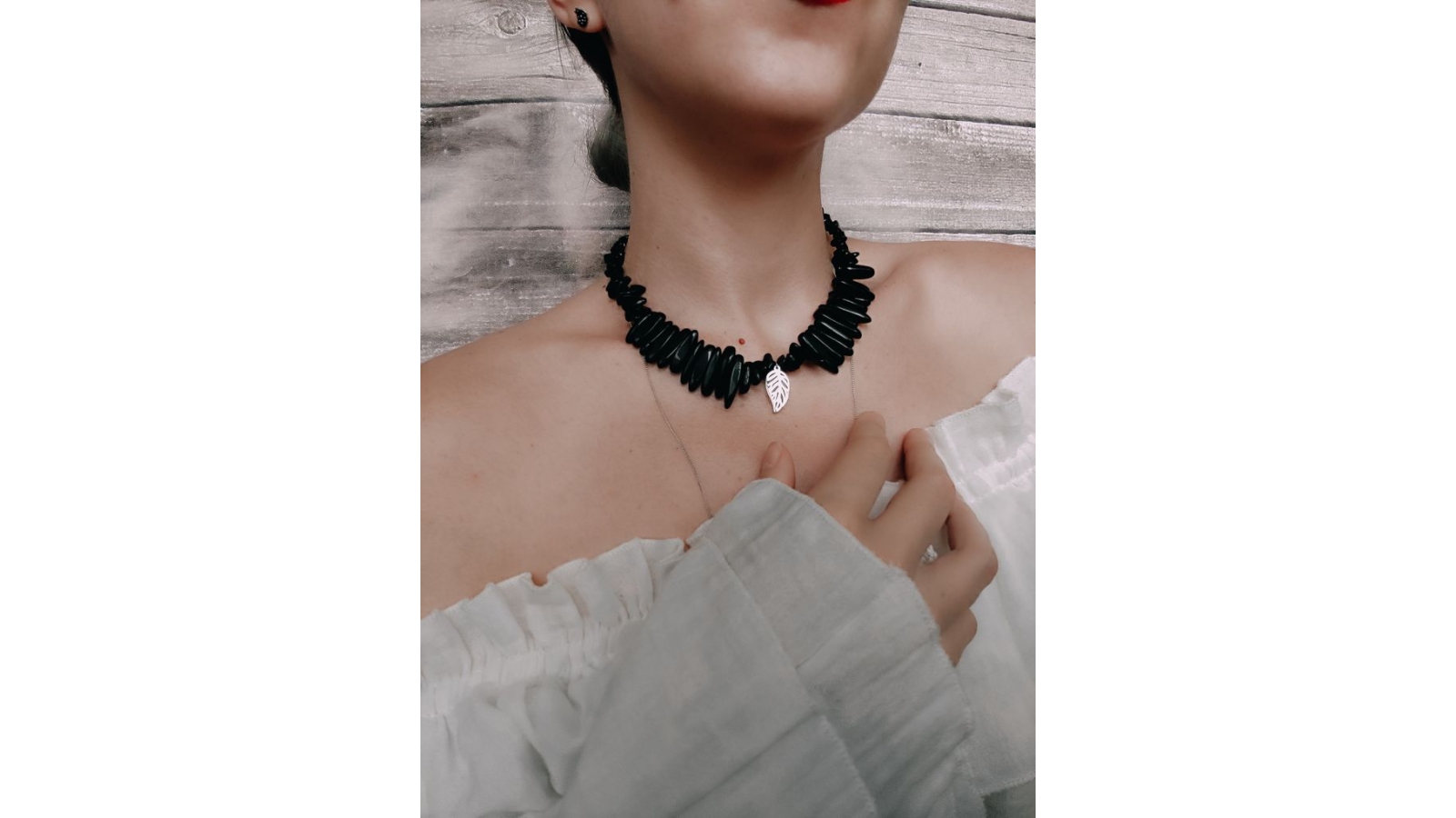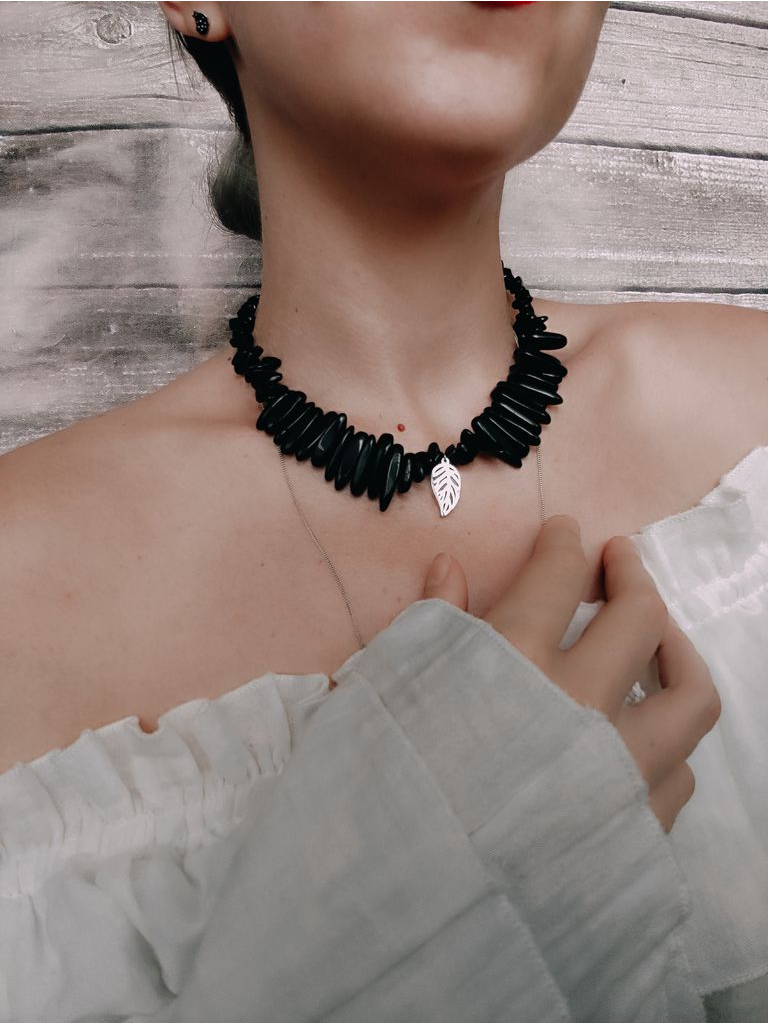 Неймовірне чорне намисто з натуральних каменів вабить таємничим шармом. Кольє виготовлене з чорного агату та обсидіану: мінералів з потужною енергетикою та помічними властивостями. Підвіска у формі ажурного листка символізує зв'язок з природою. Прикраса ручної роботи доповнена нержавіючою фурнітурою, що не тьмяніє з часом. Виріб вологостійкий, не чорніє від контакту зі шкірою та водою. Зручна застібка тогл великого розміру дозволяє вдягнути кольє за пару секунд. За основу використана мідна проволока в декілька шарів. Намисто з натуральних каменів та якісної фурнітури - крок назустріч до розумного споживання. Прикраси мають екологічне пакування. Купити чорне намисто з підвіскою лист з обсидіану та агату недорого можна в нас накладним платежем з передоплатою на доставку.