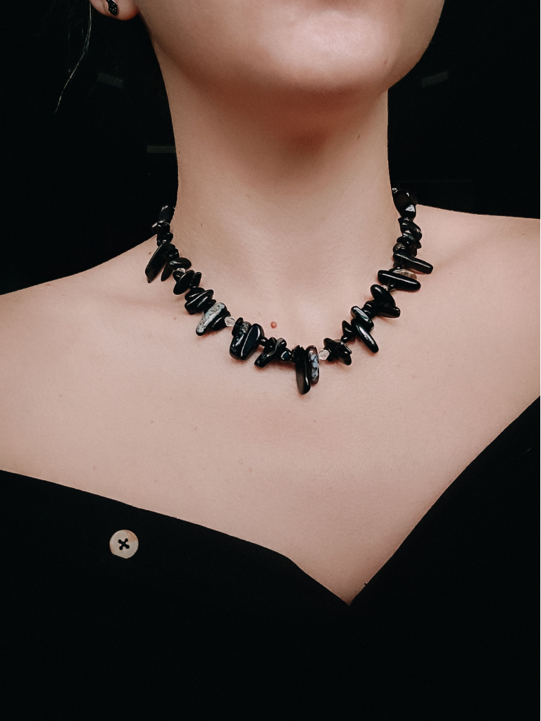 Загадкове чорне кольє намисто з натуральних каменів. Використаний обсидіан голка з ірізацією, чорний агат, ближче до центру - чорний агат з синіми вкрапленнями. Хаотична, на перший погляд, структура насправді містить порядок та є симетричною. Агат і обсидіан - потужні відьомські камені з особливою енергетикою. Для сильних, вольових, владних особистостей, які здатні з ними встановити зв'язок. Така прикраса додасть оригінальності образу, може бути стилізована до вечірніх та повсякденних look'ів.