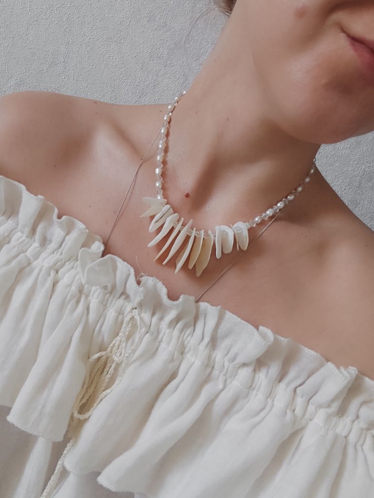 Мінімалістичний чокер ручної роботи — втілення витонченої елегантності та стилю бохо. Виготовлений у ніжному відтінку айворі, він підкреслить природну красу та додасть образу неординарний акцент. Основні елементи прикраси — мушлі річкової мідії, прісноводні перли та прозорі намистини, що гармонійно поєднуються, створюючи делікатний, але виразний вигляд. Кожна мушля вирізьблена та відшліфована вручну, що робить прикрасу унікальною, а колір мушель варіюється від молочного до легких жовтуватих відтінків.