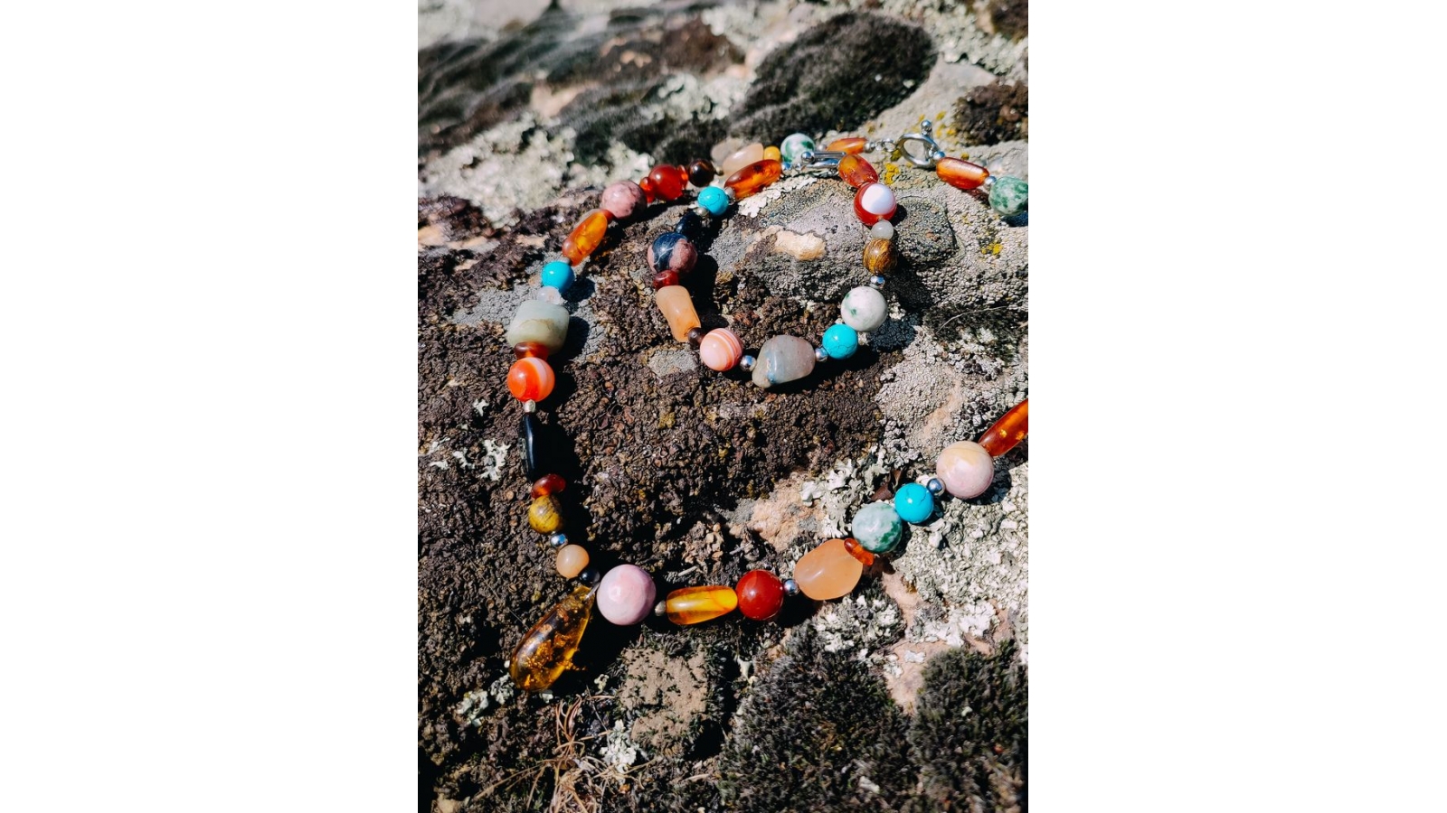 Вишуканий комплект ручної роботи з дизайнерським підбором натурального каміння. В одному виробі зібрані самоцвіти: агат кольоровий, чорний, моховий + сердолік + родоніт + тигрове око + бурштин + бірюза. Неймовірне поєднання каменів та кольорів. Унікальний комплект в єдиному екземплярі.