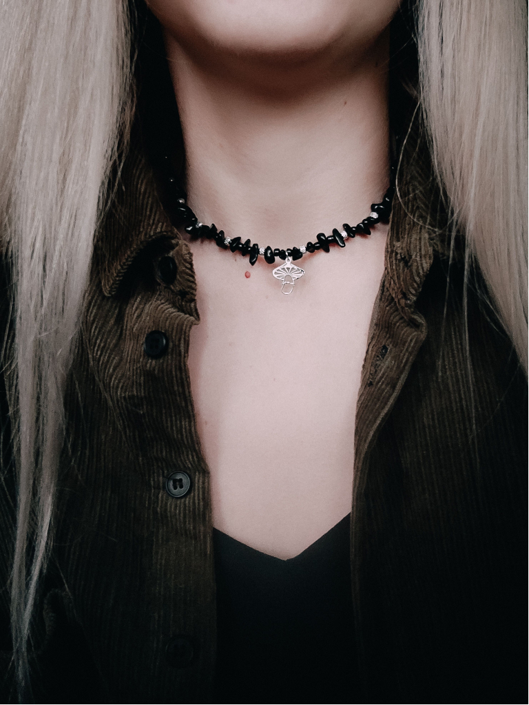 Чорний чокер ручної роботи з натурального обсидіану та дрібного чорного агату з підвіскою у формі гриба. Камені невеликого розміру, зручні для повсякденного носіння. Неправильна форма намистин додає виробу природнього вигляду та робить більш акцентним. Нержавіюча фурнітура водостійка, не темніє від контакту зі шкірою та вологою. Зручна застібка тогл має круглу форму, тому не зачіпає волосся та одяг, як часом буває з подовжуючими ланцюжками. Підвіска гриб також з нержавіючої сталі.