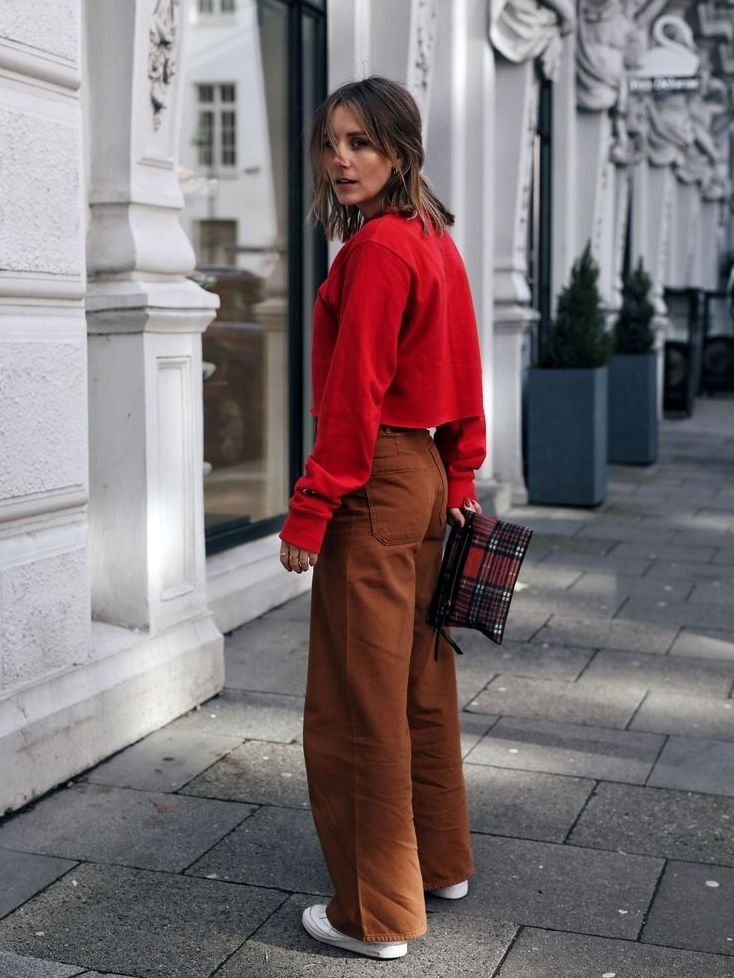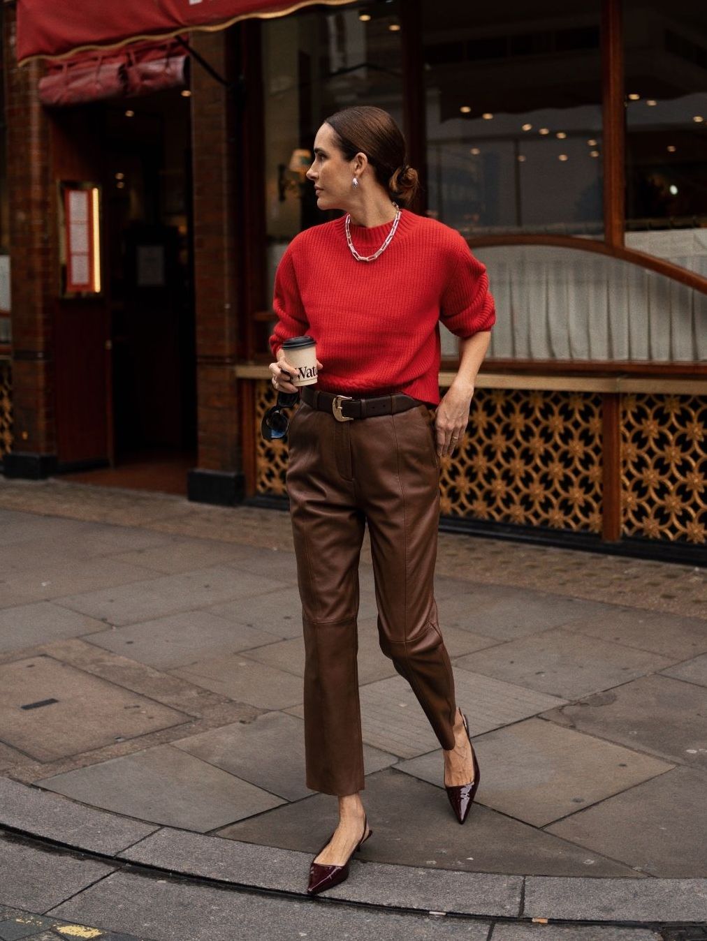 Глибокий червоний светр із вовняними коричневими штанами створюють відчуття динаміки у русі. Червона шкіряна спідниця та матове шоколадне пальто разом виглядають сучасно й гармонійно. Для неформальних виходів підійде поєднання червоного трикотажного кардигана з коричневими джинсами та ботильйонами у кремовому кольорі. Якщо хочеться мінімалістичного акценту, обмежтеся червоними рукавицями або шапкою.
