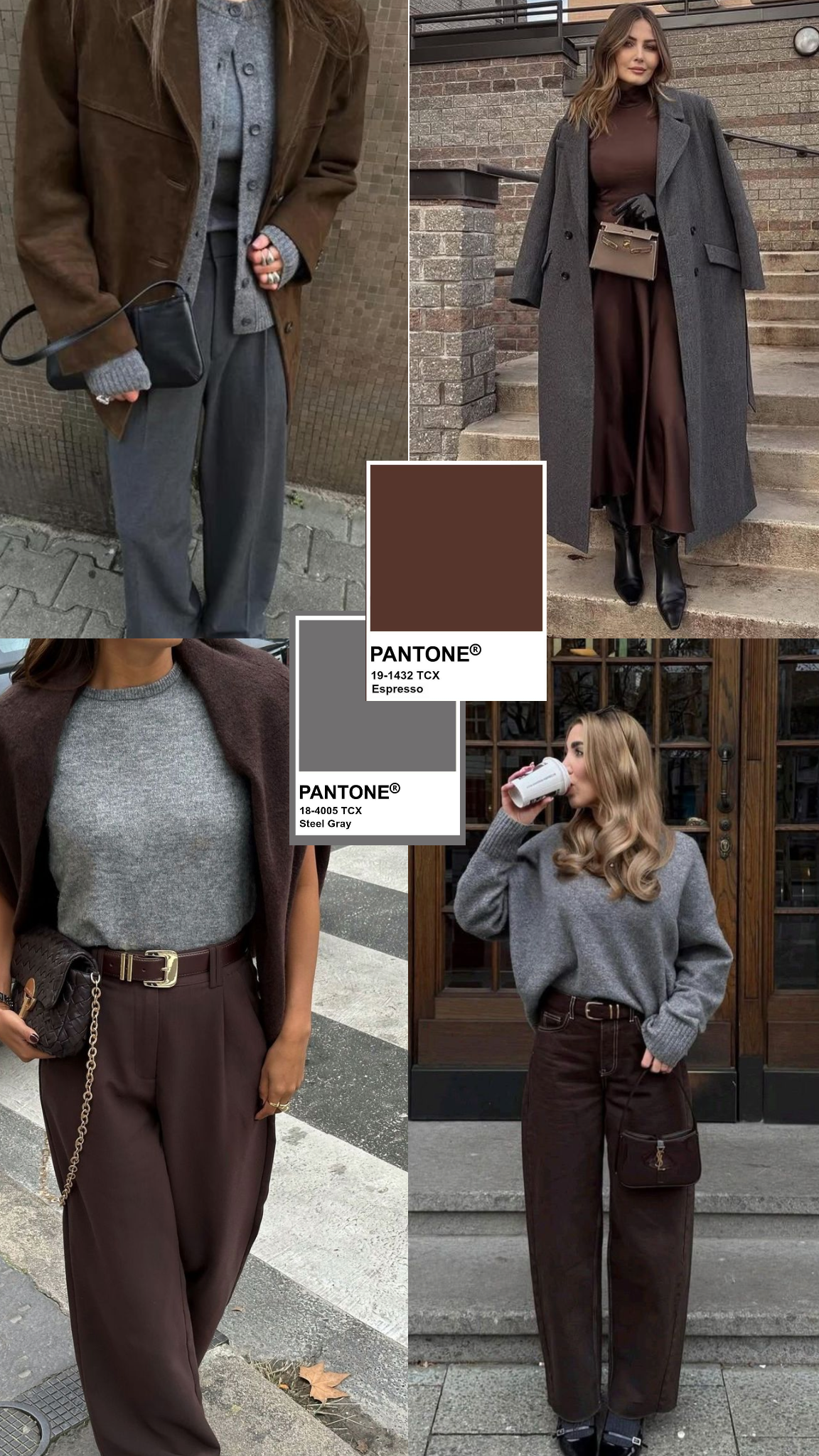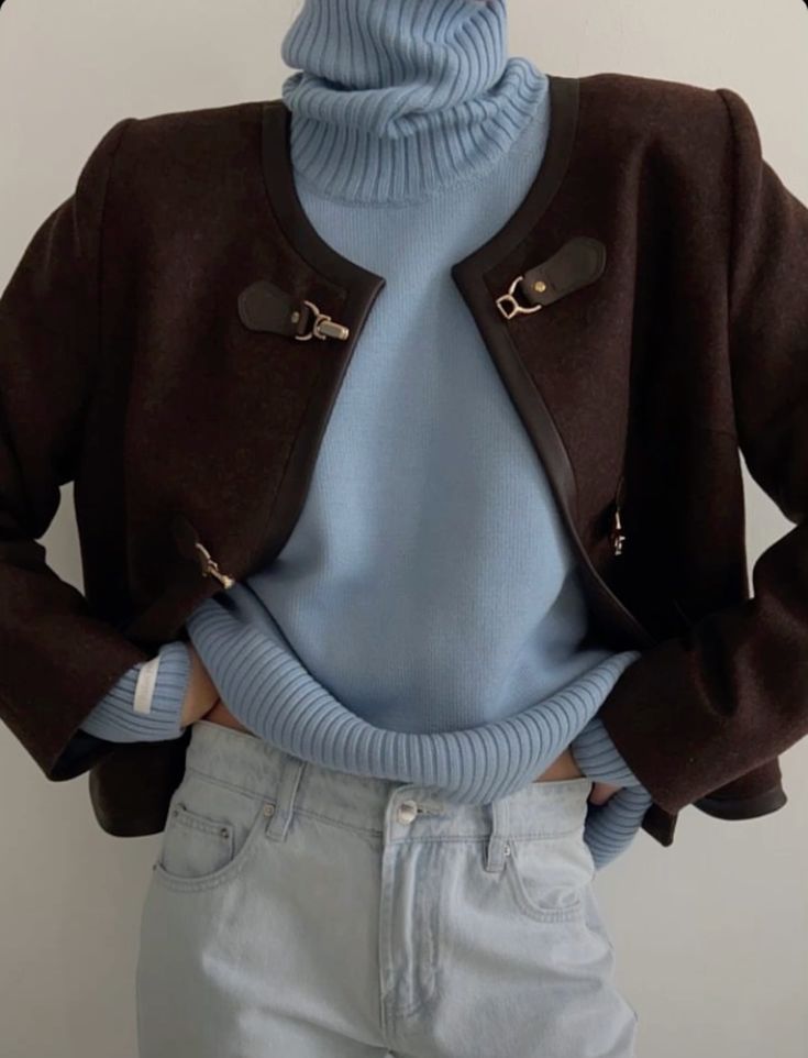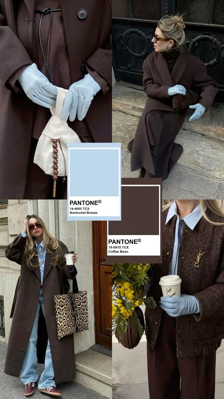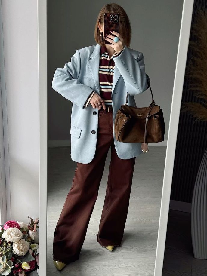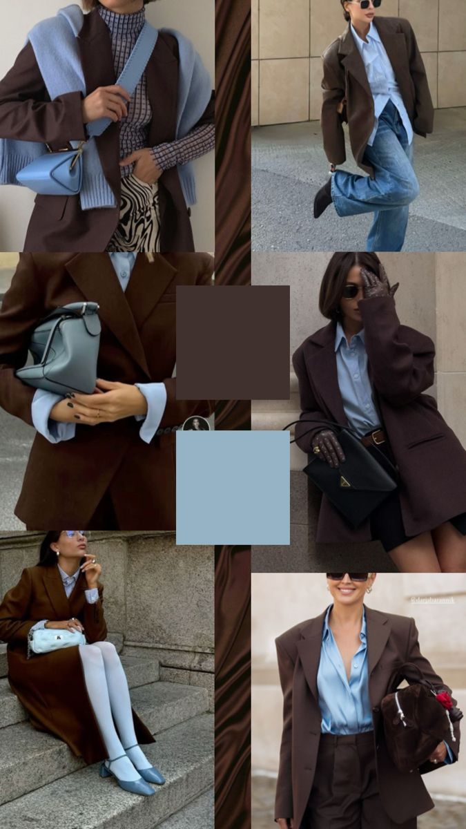Поєднання коричневого та блакитного виглядає так, ніби тепло шоколадного вечірнього горизонту зустрічається з прозорістю неба після дощу. М’який, спокійний контраст давно став улюбленим серед стилістів, адже він освіжає образ і водночас лишає його стриманим.