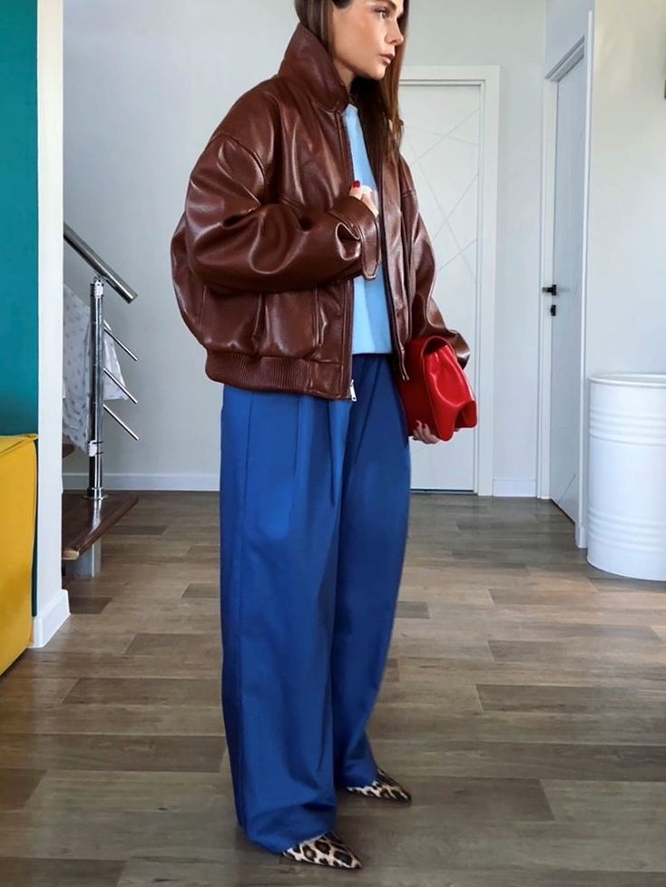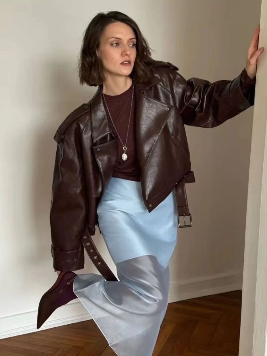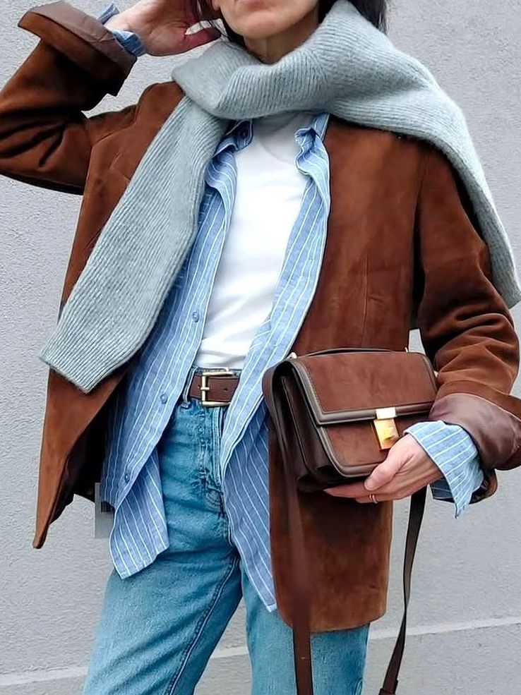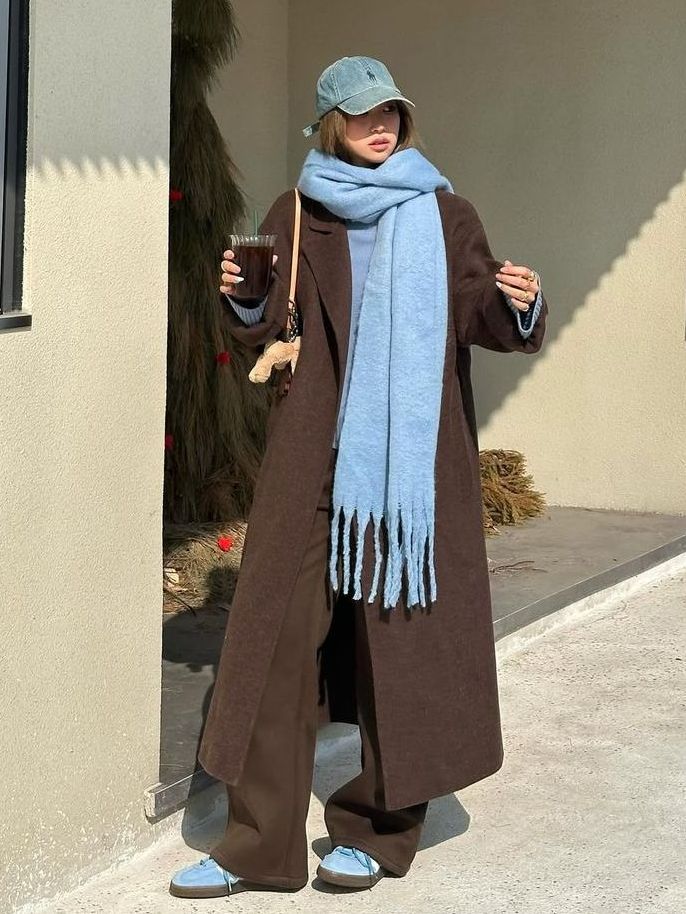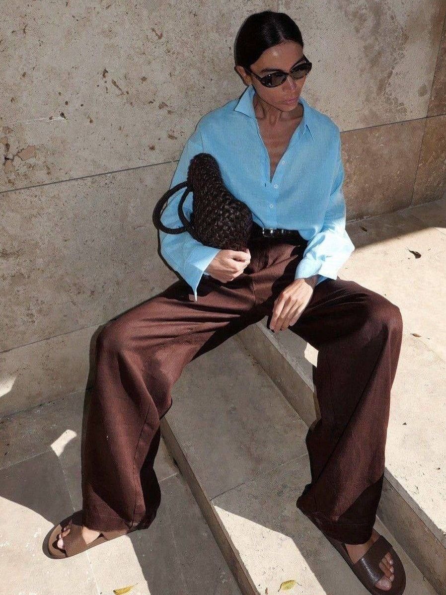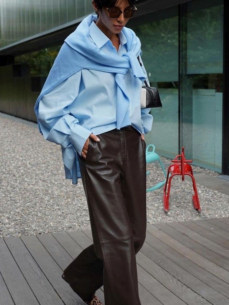 Спробуйте поєднати об’ємний коричневий трикотаж та шовкову блакитну спідницю міді, щоб отримати аутентичну скандинавську легкість. У стрітстайл-хроніках 2025 року можна побачити інший сет: масивне шоколадне пальто, під яке додають небесно-блакитну сорочку чоловічого крою та лаконічні прямі штани. Для тепліших днів підійде комбінація блакитного поло та коричневих шкіряних шортів.