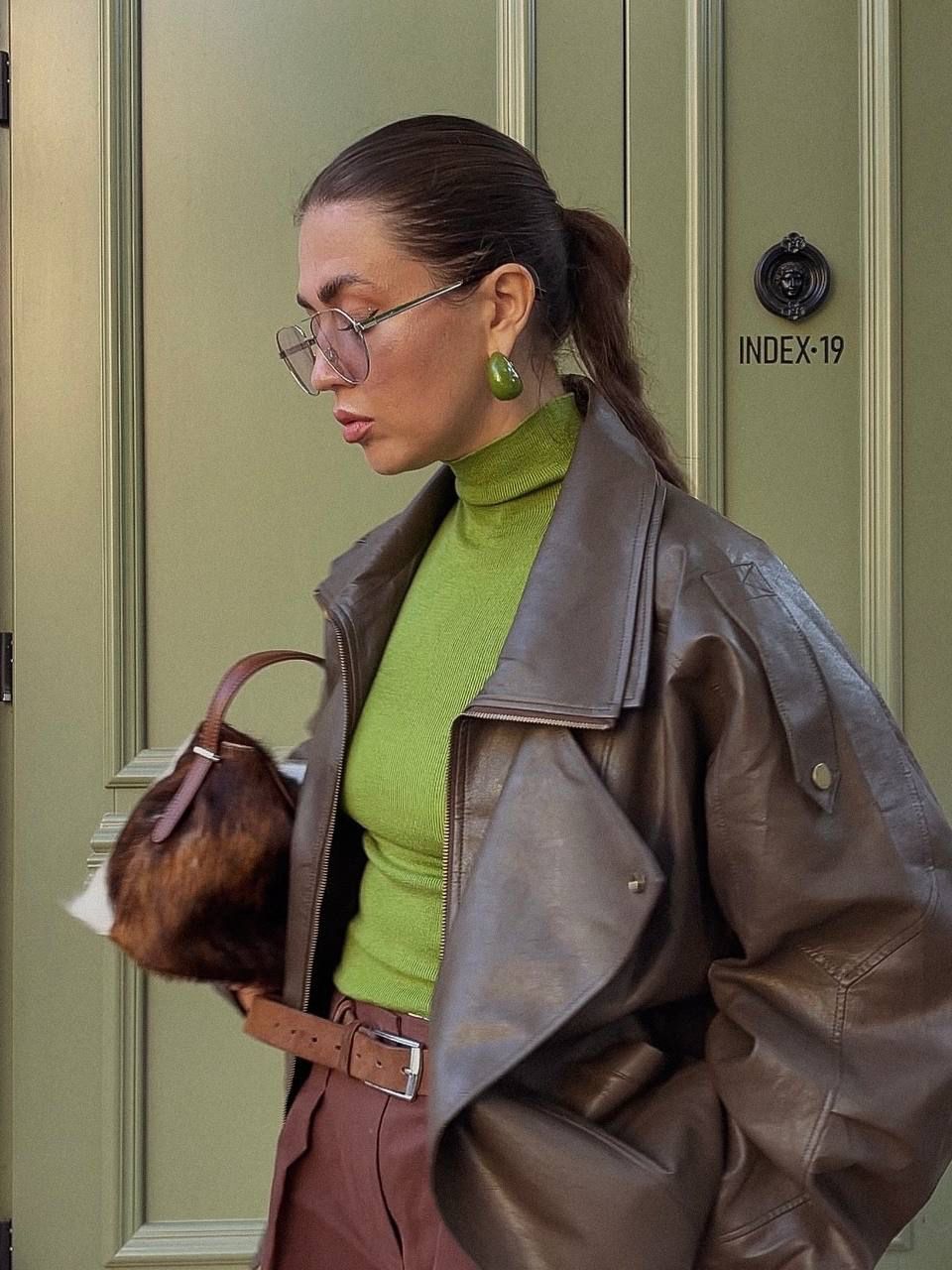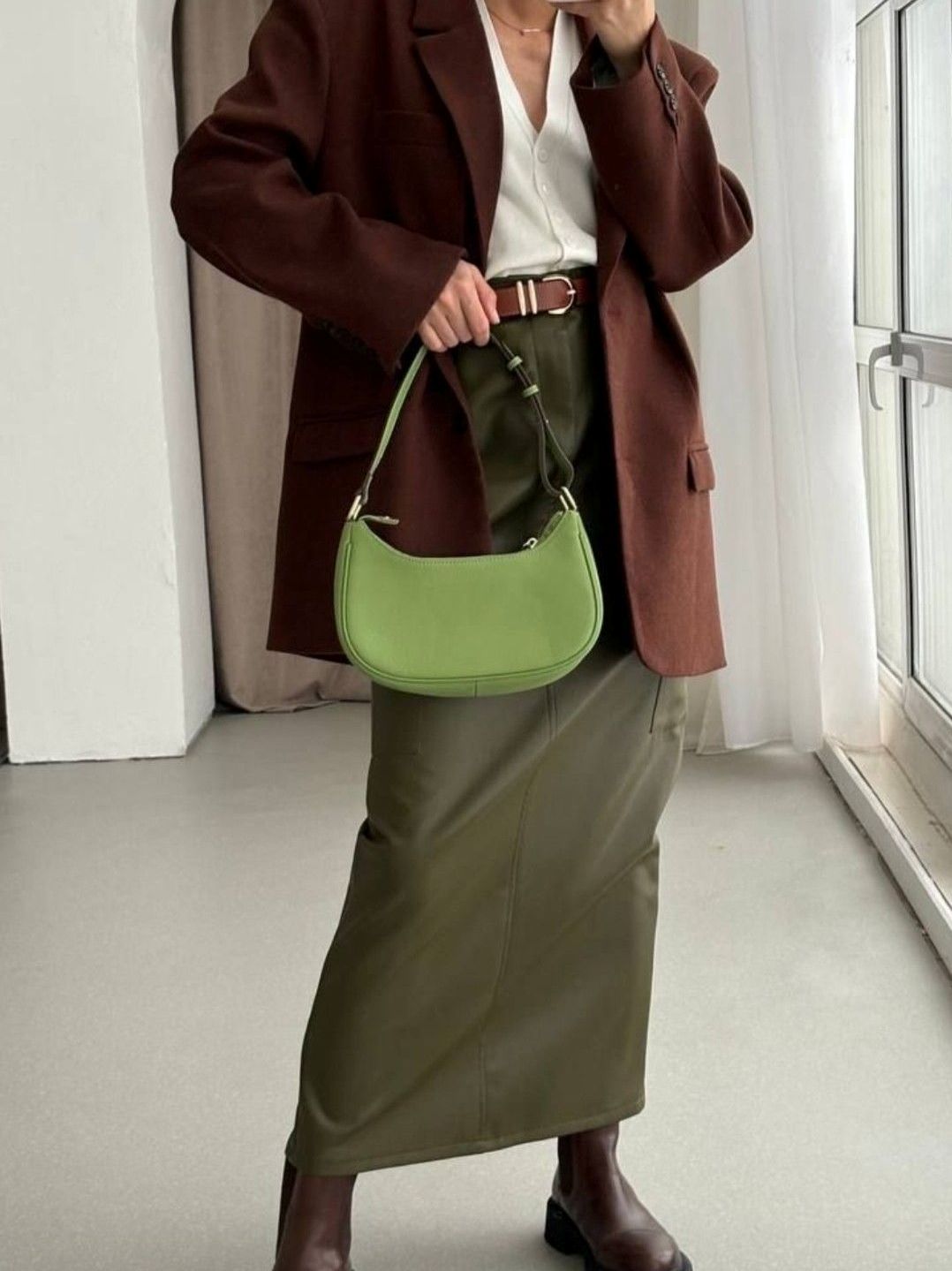 Оливковий колір можна використовувати як основний у верхній частині одягу, щоб надати обличчю свіжості. Наприклад, доповніть шкіряні коричневі палаццо затишним оливковим ангоровим светром для офісного образу. Для розслабленого вигляду спробуйте замшеву коричневу куртку-бомбер та трикотажний лонг у рубчик відтінку моху. Якщо ж зелений не до лиця, завжди можна спробувати аксесуари, наприклад, оливкову міні сумочку до стриманого коричневого пальта.