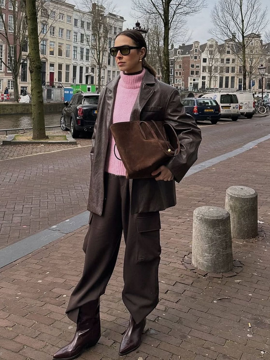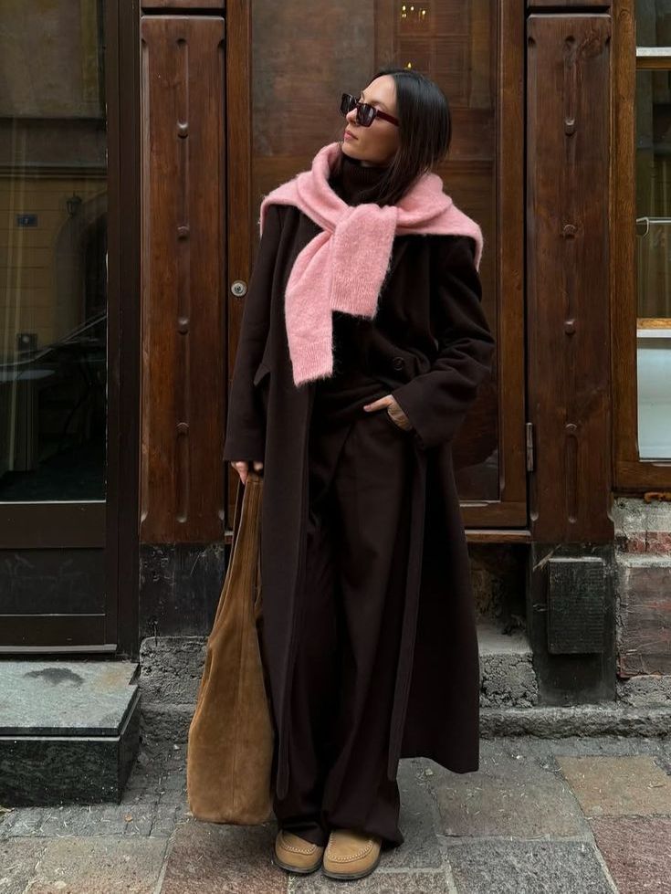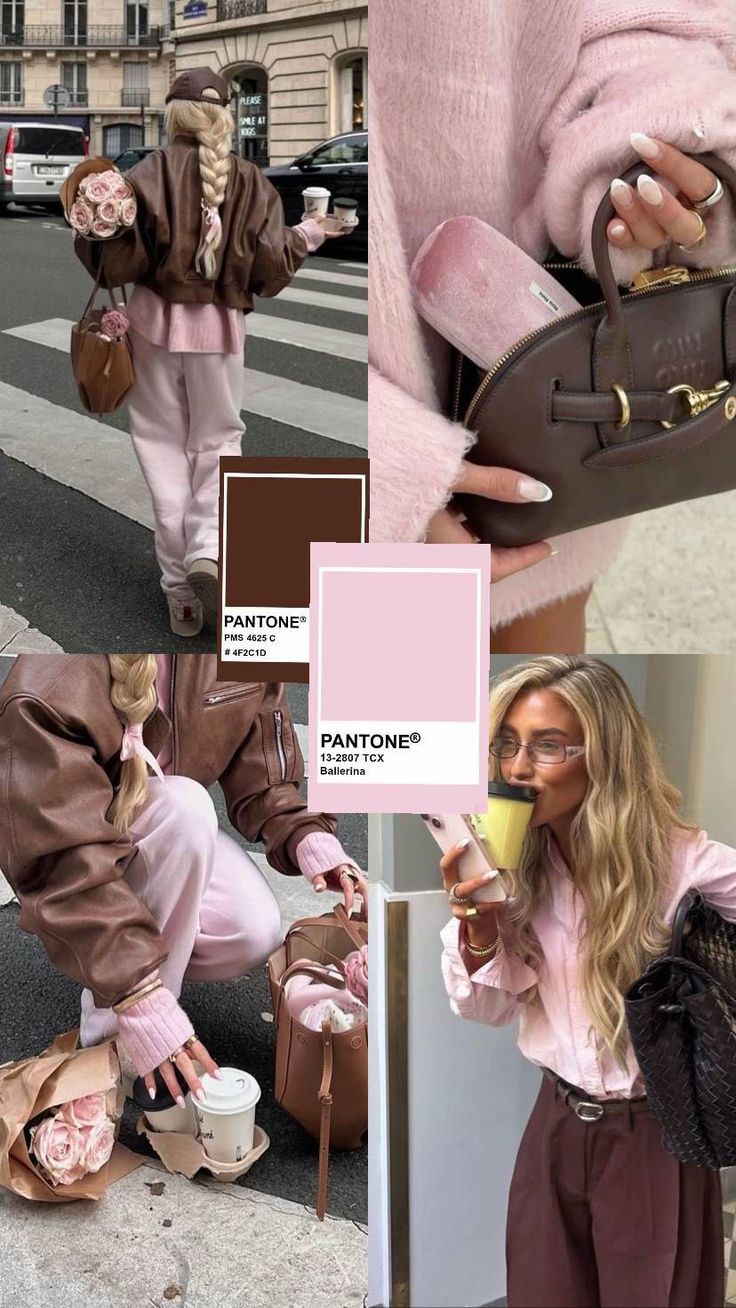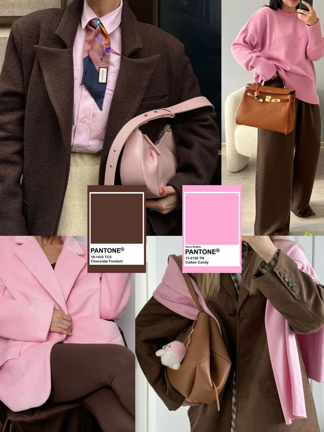 Шоколадна білизняна сукня з сорочкою холодного рожевого відтінку, яку носять зверху як кардиган, створює багатошаровість у стилі Парижа. Ефектно виглядає мікс коричневого блейзера та яскраво-рожевих брюк. Коли хочеться ніжності, додайте рожевий шарф поверх коричневого тренча.