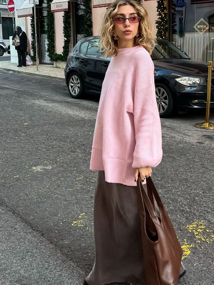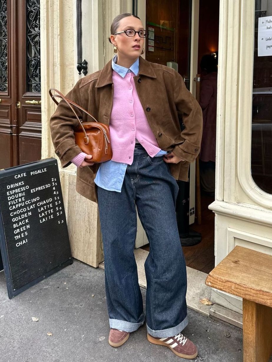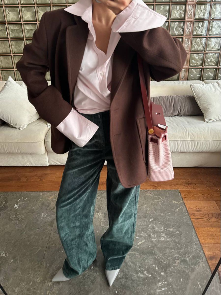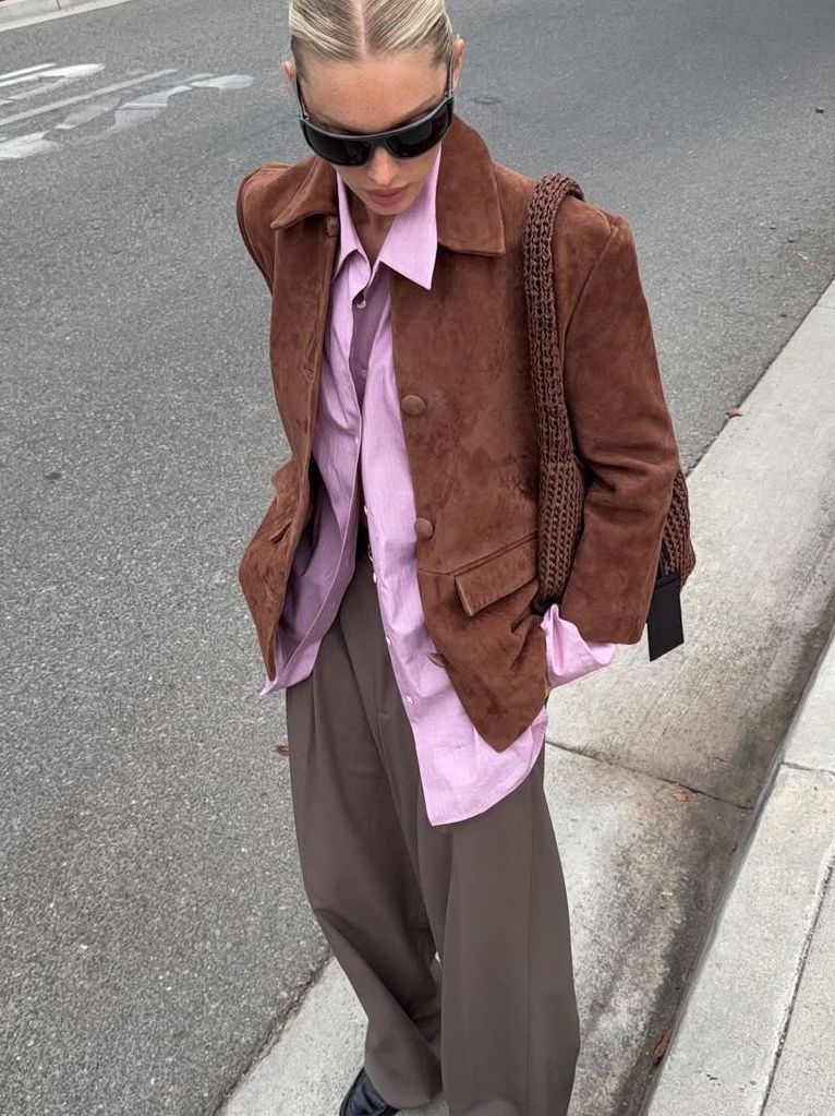 Шоколадна білизняна сукня з сорочкою холодного рожевого відтінку, яку носять зверху як кардиган, створює багатошаровість у стилі Парижа. Ефектно виглядає мікс коричневого блейзера та яскраво-рожевих брюк. Коли хочеться ніжності, додайте рожевий шарф поверх коричневого тренча.