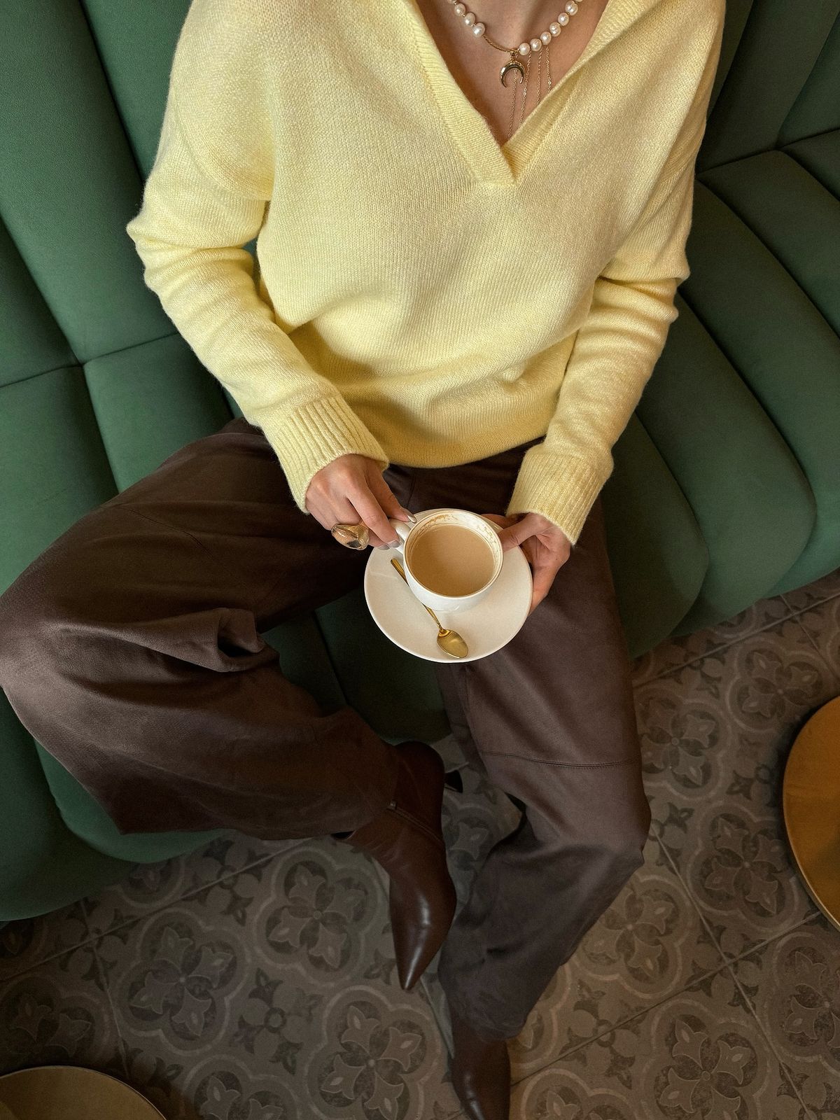 Колір вершкового масла та інші відтінки жовтого у парі з коричневим виглядають сонячно й пожвавлюють образ. Кольорове поєднання нагадує перші промені сонця, які падають на дерев’яну поверхню та створюють теплу гру світла.