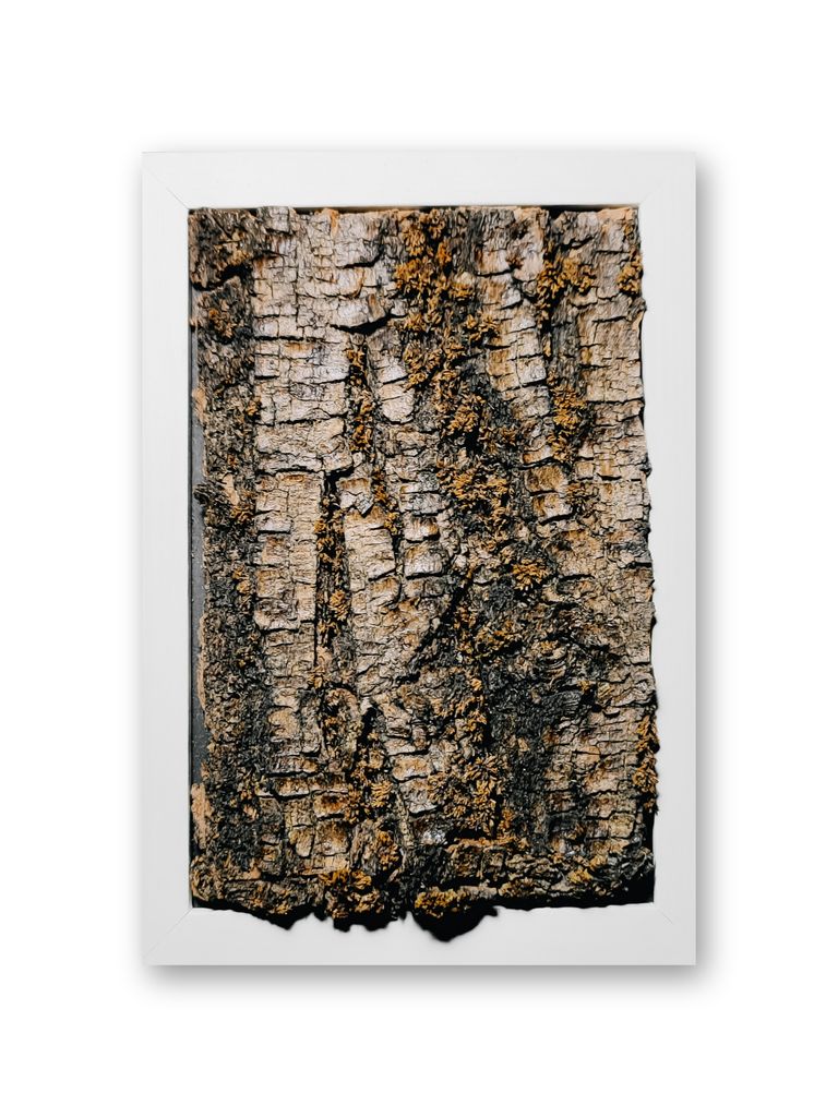 Ця зачаровуюча композиція на лісову тематику поєднує справжню кору дерева та лишайник, створюючи унікальний та природний декор для вашого інтер'єру. Розміщена у стильній білій дерев'яній рамі, вона додає вашому простору відчуття гармонії з природою.