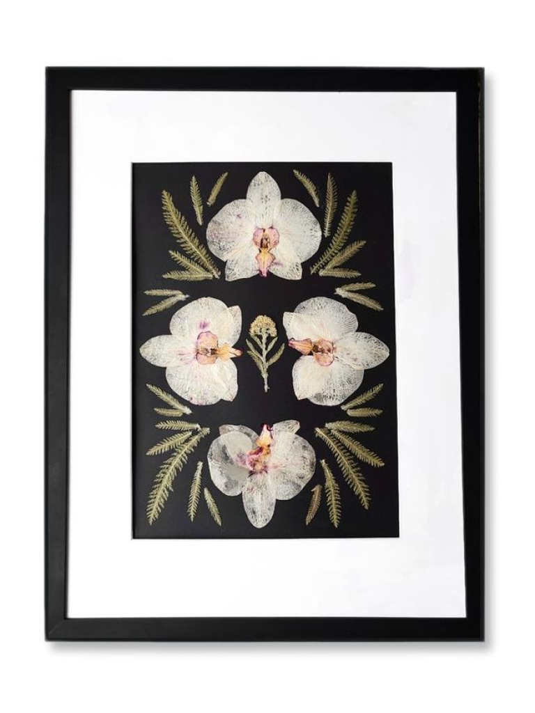 Велика настінна картина-гербарій з орхідеями — унікальна композиція, де чотири білі квіти розташовані у формі хреста, кожна звернена у свій бік, наче позначаючи сторони світу. У центрі знаходиться квітка деревію, яку обрамлюють мереживні листки, схожі на легкі візерунки папороті. Чорний фон підкреслює світлі відтінки пелюсток та створює відчуття глибини.