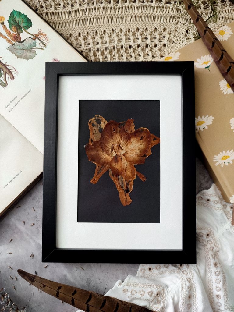 Півник зберіг у собі мову літа: на чорному тлі його вигини стають скульптурними, пелюстки — мов вигоріле золото. Темно-коричневий відтінок, який набуває рослина з часом, лише посилює ефект вінтажного гербарію. Це ботанічна композиція не про квіти, а про тишу й гармонію, яка народжується зі спокою.