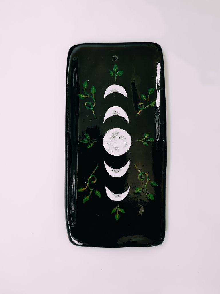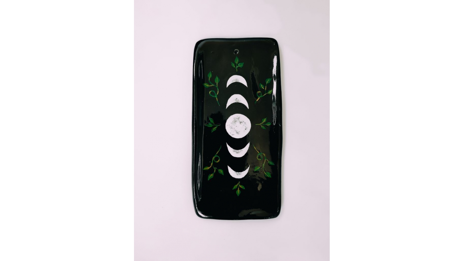 Малюнок, що прикрашає цю підставку, об'єднує різні фази місяця з витонченими зеленими гілочками, що надають їй ботанічного шарму та символіки природного зростання та розвитку. Акрилова фарба покрита лаком, що надає виробу водостійкості та блиску.