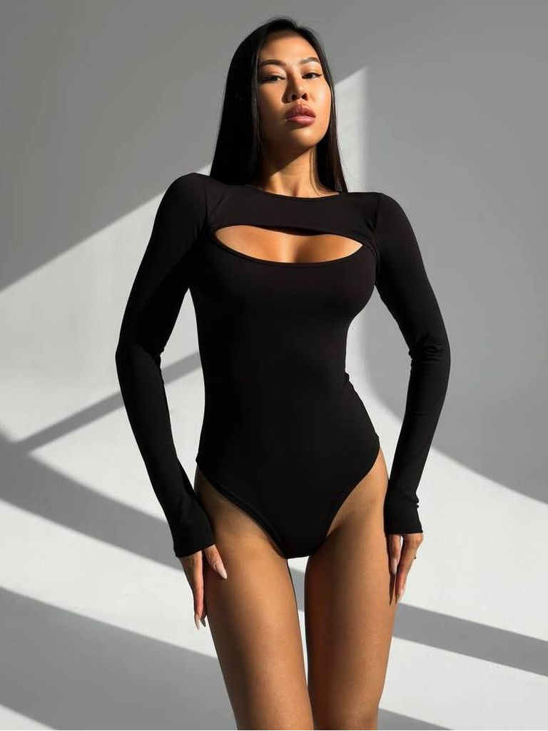 Подовжені рукави до середини долоні створюють витончений силует і підкреслюють лінію рук. Горловина човником додає жіночності, а поздовжній виріз на декольте формує виразний акцент. При цьому шия залишається закритою, що дозволяє носити боді в прохолодну погоду та комбінувати його з верхнім одягом або жакетом. Чорний колір підсилює графічність моделі та робить її доречною як у повсякденних, так і в більш стриманих образах із джинсами, брюками чи спідницею.