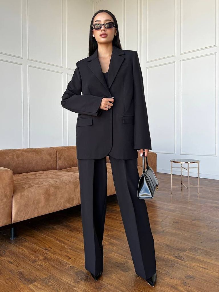 Діловий костюм у стриманому лаконічному стилі виконаний з якісної костюмної тканини. Верх представлений класичним піджаком, що застібається на один ґудзик на рівні талії. Комір англійський, з чіткими лініями, що додають виробу стриманості. Посадка оверсайз, структурований дизайн, акцентні плечі. Шліци на спинці та манжетах рукавів. Брюки високої посадки, на блискавці та застібці, що прихована тканиною. Є кишені, драпірування, характерне для класичних брюк. Ззаду пояс на гумці, завдяки чому брюки ідеально сідають на фігуру та зручні у повсякденному носінні, не сковують рухів. Крій штанів прямий, широкий, довжина повна. В асортименті декілька базових кольорів. Носити комплект можна костюмом чи окремо. Замовити та купити жіночий брючний костюм з піджаком та широкими прямими штанами недорого можна в нас накладним платежем з передоплатою на доставку. Відправляємо в Київ, Дніпро, Житомир, Львів, Запоріжжя, Тернопіль, Одесу, Івано-Франківськ, Суми, Кропивницький, Полтаву, Черкаси та будь-який населений пункт України.