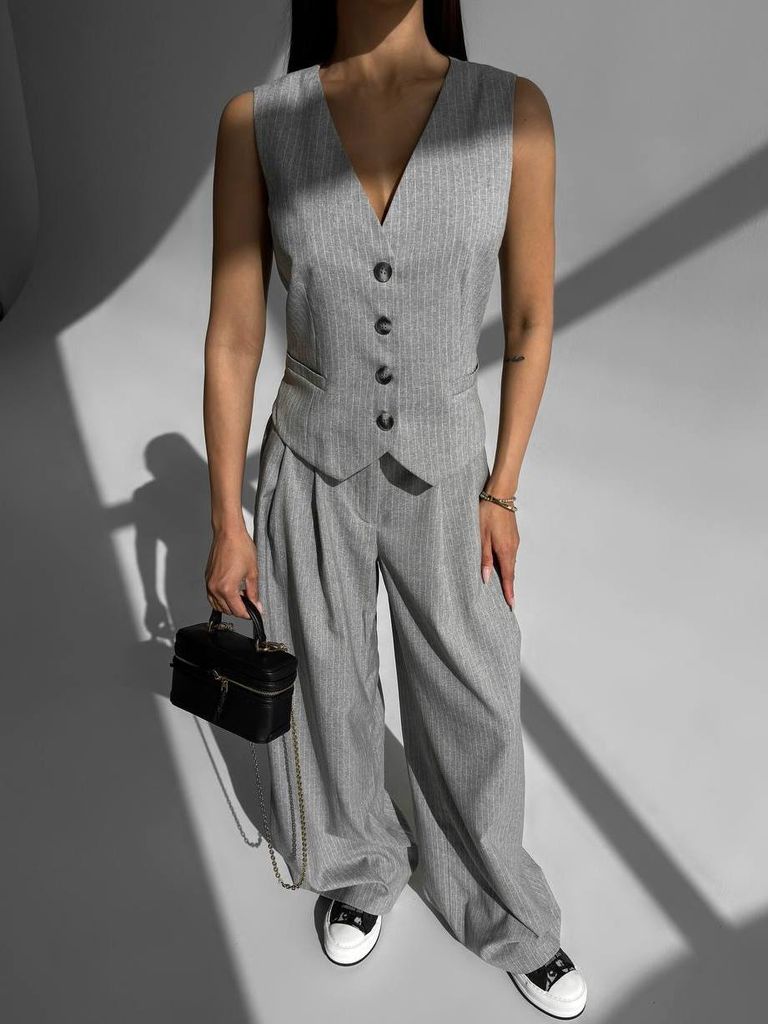 Дрібна смужка займає лідируючі позиції на модному олімпі. Чудовий спосіб урізноманітнити гардероб - за допомогою брючного костюму. Модель з широкими брюками палаццо та жилетом дозволяє створити безліч стильних комбінацій. Штани високої посадки, на гумці ззаду. Жилет приталений, виконує роль топа, можна носити як без нижнього шару, так і на тонкий гольф чи футболку. Штани з защипами і кишенями, максі довжина. Ґудзики на жилеті функціональні. Замовити та купити костюм брюки палаццо та жилет в смужку недорого можна в нас накладним платежем з передоплатою на доставку. Відправляємо в Київ, Дніпро, Житомир, Львів, Запоріжжя, Тернопіль, Одесу, Івано-Франківськ, Суми, Кропивницький, Полтаву, Черкаси та будь-який населений пункт України.
