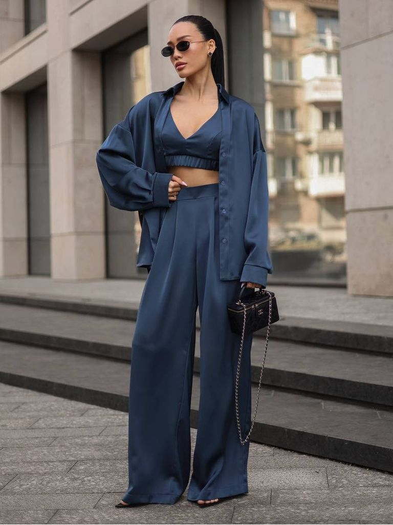 Вишуканий та елегатний костюм трійка з якісного щільного сатину. Комплект складається з широких штанів палаццо, кроп топу халтера та сорочки з глибокими бічними вирізами, завдяки чому її можна по різному зав'язувати. Замовити та купити однотонний сатиновий брючний костюм 3в1 з широкими штанами палаццо, сорочкою і топом недорого можна в нас накладним платежем з передоплатою на доставку. Відправляємо в Київ, Дніпро, Житомир, Львів, Запоріжжя, Тернопіль, Одесу, Івано-Франківськ, Суми, Кропивницький, Полтаву, Черкаси та будь-який населений пункт України.