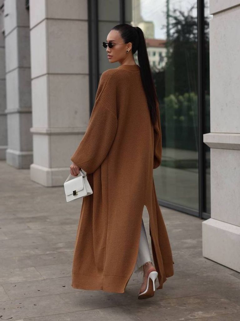 Затишний довгий в'язаний кардиган створений для комфорту та елегантності. Завдяки натуральній бавовні у складі він приємний до тіла та добре пропускає повітря, віскоза додає м’якості та ніжного шовковистого блиску, а поліестер підвищує зносостійкість і зберігає форму виробу. Класична в’язка додає стриманої елегантності, а акцентований перед із дрібною в’язкою створює вишуканий візуальний ефект. Довгі об’ємні рукави забезпечують свободу рухів, а шліца ззаду додає легкості та динамічності силуету.