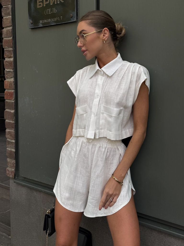 Білий лляний костюм із укороченою сорочкою та шортами — це досконала пара для спекотних днів, коли хочеться легкості, повітряності й мінімалізму в образі. Натуральна тканина з льону дарує тілу комфорт навіть у найспекотнішу погоду, а вільний крій і дихаючі силуети забезпечують свободу руху.