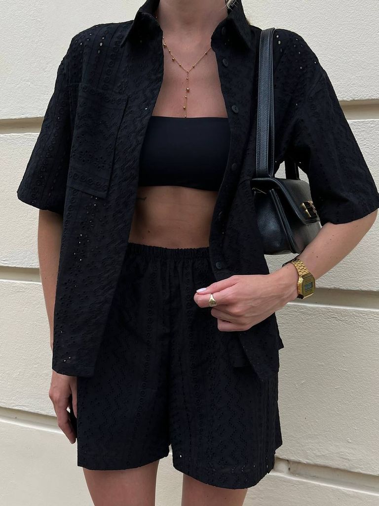 Легкий костюм з шортами з натуральної тканини. Матеріал верху - прошва, бавовна з вишивкою та перфорацією. Натуральний матеріал освіжає в спеку та пропускає повітря. Базовий чорний колір дозволяє створювати стильні образи для носіння в місті, на природі, на відпочинку. Верх представлений сорочкою з короткими рукавами. На рівні грудей накладні кишені. Посадка по фігурі вільна. Шортики високої посадки, на гумці. Завдяки підкладці, що також виконана з натуральної тканини, шорти не прозорі. Замовити та купити чорний бавовняний костюм з шортами та сорочкою із прошви з вишивкою недорого можна в нас накладним платежем з передоплатою на доставку. Відправляємо в Київ, Дніпро, Житомир, Львів, Запоріжжя, Тернопіль, Одесу, Івано-Франківськ, Суми, Кропивницький, Полтаву, Черкаси та будь-який населений пункт України.