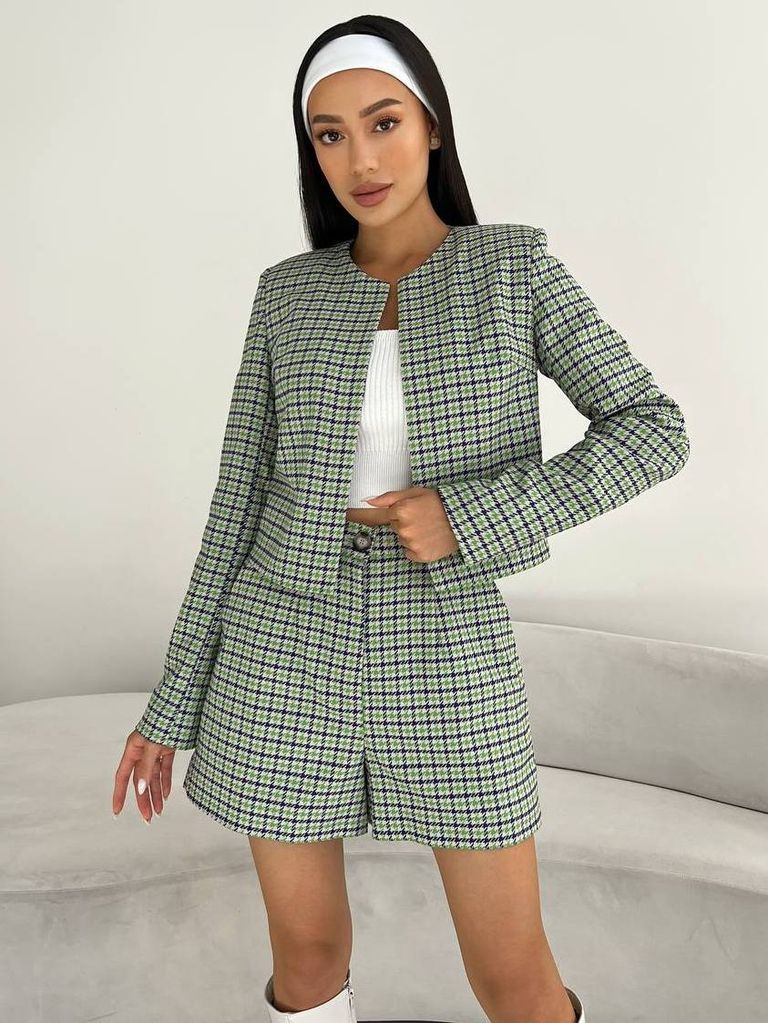 Стильний та зручний костюм з шортами та вкороченим жакетом. Класичний дрібний принт гусяча лапка в різних кольорах. Жакет без коміра, з округлим вирізом горловини, без застібок. Шорти високої посадки, вільні у стегнах, середньої довжини. Костюм демісезонний, матеріал середньої щільності, осінь/весна. Замовити та купити костюм з шортами та жакетом в гусячу лапку недорого можна в нас накладним платежем з передоплатою на доставку. Відправляємо в Київ, Дніпро, Житомир, Львів, Запоріжжя, Тернопіль, Одесу, Івано-Франківськ, Суми, Кропивницький, Полтаву, Черкаси та будь-який населений пункт України.