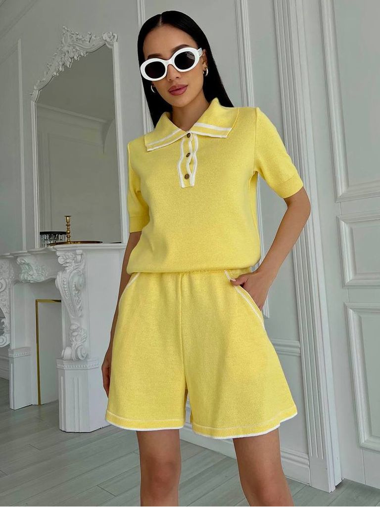 М'який трикотажний костюм преміум якості від українського виробника. Виконаний з 100% бавовни, якісна пряжа. Трикотажна структура тканини дає тілу дихати. Натуральний склад матеріалу зумовлює терморегуляцію, пропускає повітря та охолоджує в спеку. Футболка поло з широким коміром має акуратний кольоровий акцент. Рукави короткі, з манжетною резинкою. Низ виробу також оформлений в'язкою в рубчик. Шорти високої посадки на резинці. Кишені декоровані кольоровим швом. Низ шортів вільний, не облягає стегна, візуально робить ноги стрункішими. Посадка оверсайз. Замовити та купити в'язаний трикотажний бавовняний костюм з шортами преміум якості недорого можна в нас накладним платежем з передоплатою на доставку. Відправляємо в Київ, Дніпро, Житомир, Львів, Запоріжжя, Тернопіль, Одесу, Івано-Франківськ, Суми, Кропивницький, Полтаву, Черкаси та будь-який населений пункт України.