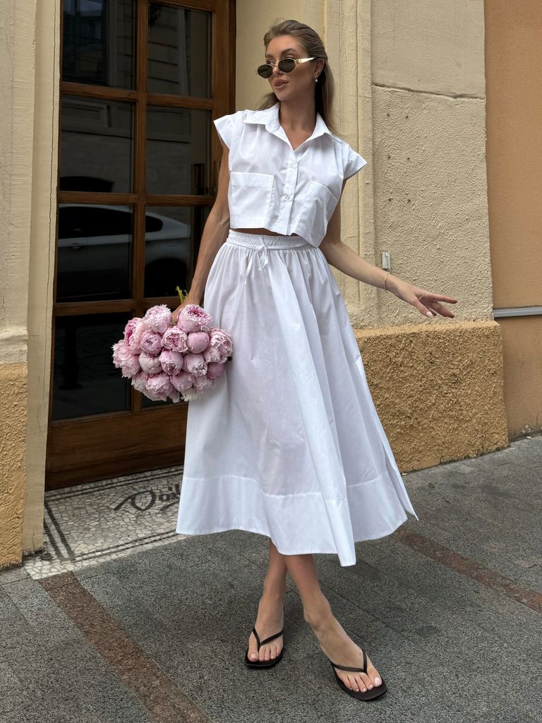 Білий бавовняний костюм із топом і спідницею — універсальний літній комплект, що поєднує в собі комфорт, функціональність і витонченість. Завдяки 100% натуральній бавовні тканина приємно прилягає до тіла, дозволяє шкірі дихати навіть у найспекотніші дні, а сам образ виглядає лаконічно, але дорого.