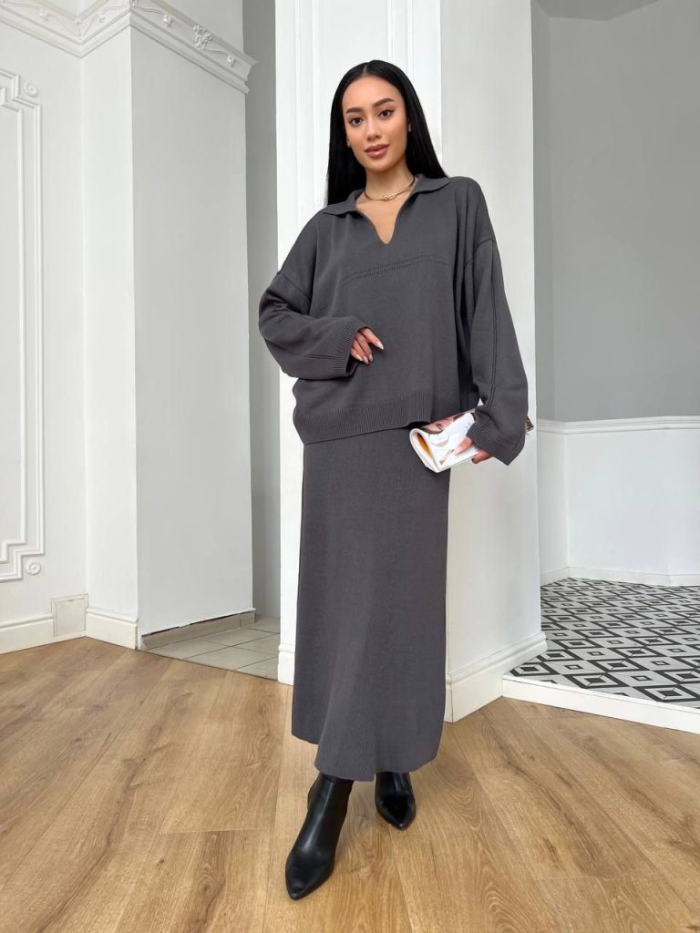 Сучасна варіація трикотажного костюму з довгою спідницею. Костюм виконаний з високоякісної бавовни у дрібній в'язці, що виключає можливість виникнення катишків від тертя чи після прання. Комплект складається з дещо вкороченого широкого за фасоном світшота та трапецієподібної спідниці А силуету. Стиль межує між елегантним та спортивним, ідеально підходить до міських кежуальних образів. Мінімалістичні шви на світшоті. Декольте оформлене вирізом в стилі поло. Надзвичайно стильний і багатогранний костюм для повсякденного носіння. Замовити та купити в'язаний бавовняний костюм з довгою спідницею недорого можна в нас накладним платежем з передоплатою на доставку. Відправляємо в Київ, Дніпро, Житомир, Львів, Запоріжжя, Тернопіль, Одесу, Івано-Франківськ, Суми, Кропивницький, Полтаву, Черкаси та будь-який населений пункт України.