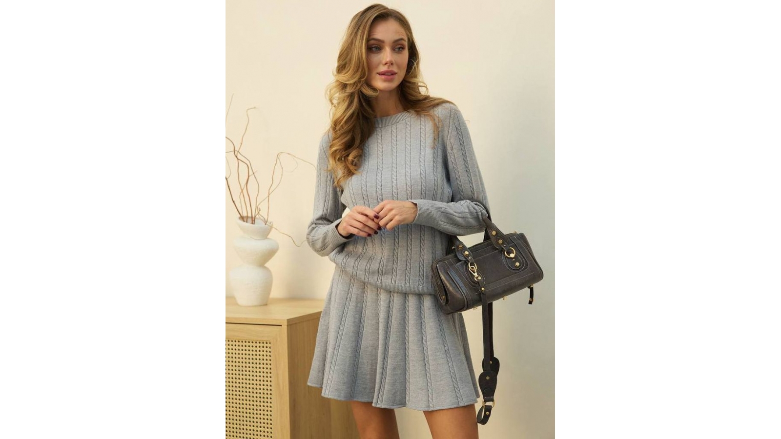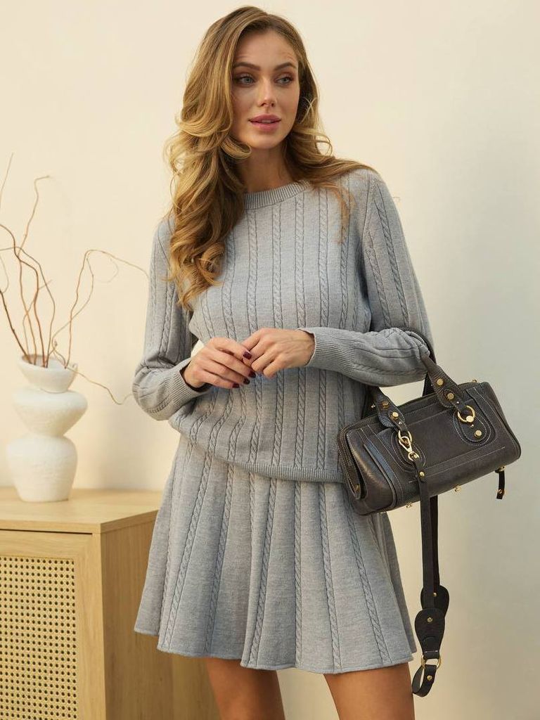 Жіночний в'язаний костюм з короткою спідницею допоможе виглядати грайливо та привабливо навіть в холодну пору року. Костюм виконаний з повністю натуральної пряжі. Бавовна в складі забезпечує комфортну терморегуляцію та запобігає потінню при перепаді температур. Меринос та кашемір забезпечує тепло та м'якість навіть при тонкій товщині тканини. В'язка в дрібними косами виглядає класично, але цікавіше за звичайний рубчик. Светр має круглу горловину комфортного розміру (не стискає горло), довгі рукави та стандартну довжину. Спідниця з посадкою на талію. Крій трапеція підходить на різні типи фігури. Спідниця коротка, але комфортної довжини, не ультра міні. Цей костюм прослужить не один сезон, тому однозначно вартує вкладень.