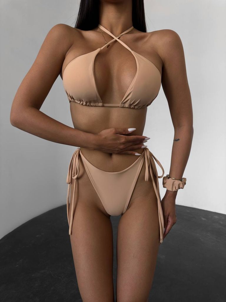 Бежевий купальник бікіні на зав’язках створює ефект другої шкіри та вигідно виділяється на фоні засмаги. Нейтральний відтінок виглядає делікатно та дорого. Ліф у формі трикутників шторок легко рухається по основі, тому посадку можна адаптувати під будь яку форму грудей. Тонкі зав’язки дозволяють регулювати об’єм і забезпечують комфортну фіксацію. Плавки бразиліана високої посадки з боковими зав’язками не врізаються в шкіру та дозволяють підібрати зручну фіксацію на тілі. Трикутна форма з обох сторін красиво відкриває стегна, а заокруглений виріз спереду середньої глибини забезпечує акуратний вигляд. Купальник виготовлений в Україні з двошарового матового біфлексу. Матеріал щільний, еластичний, не просвічується та виглядає акуратно зсередини і зовні. Модель ідеально підходить для рівної засмаги та активного відпочинку.