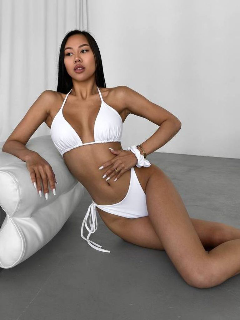 Білий купальник бікіні на зав’язках виглядає свіжо та ефектно на засмаглій шкірі. Ліф у формі рухомих трикутників дозволяє регулювати посадку і підлаштовувати модель під власні параметри. Зав’язки на шиї та спині допомагають створити комфортну фіксацію, а бретельки можна розміщувати класично або перехресно. Плавки високої посадки з боковими зав’язками не врізаються в шкіру і дозволяють точно налаштувати посадку. Трикутна форма та середній передній виріз забезпечують акуратний вигляд і комфорт. Купальник виготовлений в Україні з якісного подвійного матового біфлексу, що не просвічується і робить виріб більш щільним. Універсальна базова модель для літа.