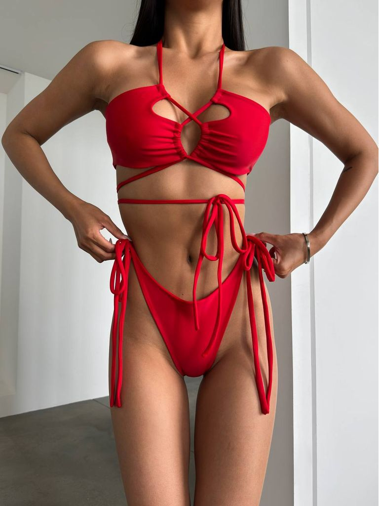 Червоний купальник бікіні з вирізами та зав'язками створений для тих, хто не боїться уваги. Верх моделі має центральні зав’язки, які перехрещуються та формують округлий чуттєвий виріз по центру грудей. Такий крій виглядає виразно, але зберігає баланс між відкритістю та естетикою. Кожна чашечка доповнена невеликим вирізом, що додає дизайну глибини та характеру. Тонкі зав’язки фіксуються на шиї, а додаткова зав’язка спереду дозволяє регулювати об’єм і залишає довгі шлейки, які стають стильним акцентом у русі. Плавки бразиліани з високою посадкою підкреслюють лінію талії та візуально подовжують ноги. Бічні тонкі зав’язки дають можливість налаштувати посадку максимально комфортно.