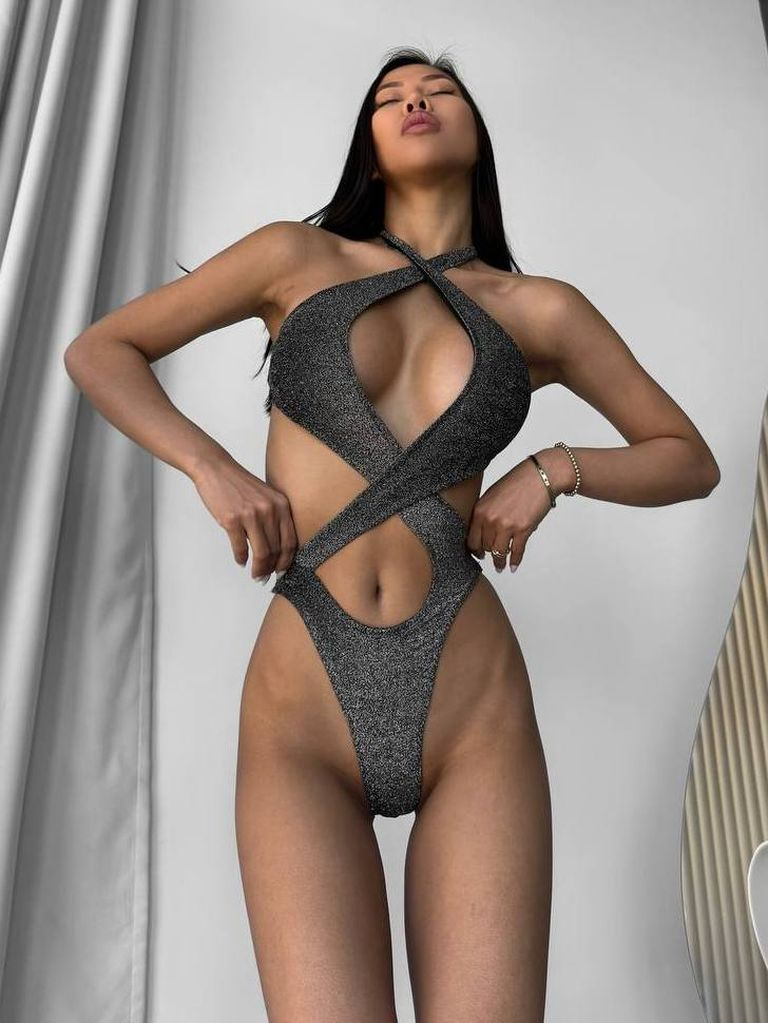 Купальник вдягається через шию у форматі халтер. Спереду тканина проходить хрест-навхрест, формуючи чуттєвий виріз у зоні декольте та акцентуючи груди. Ширина посадки в грудях регулюється зав’язкою на спині, розташованою на рівні під лопатками, що дозволяє точно підігнати модель по фігурі. Нижче спереду передбачене ще одне перехрещення тканини, яке плавно переходить у плавки з високою посадкою та глибокими бічними вирізами. Така конструкція створює візуальний ефект трьох вирізів на передній частині купальника: у зоні шиї, посередині грудей та в області живота біля пупка. Завдяки цьому силует виглядає витягнутим і максимально виразним. Зі спинки плавки мають завищену посадку з високими вирізами та трикутну форму, що підкреслює лінію сідниць і візуально подовжує ноги. Блискучий графітовий відтінок робить модель особливо ефектною на сонці та ідеальною для пляжних виходів і курортних образів.