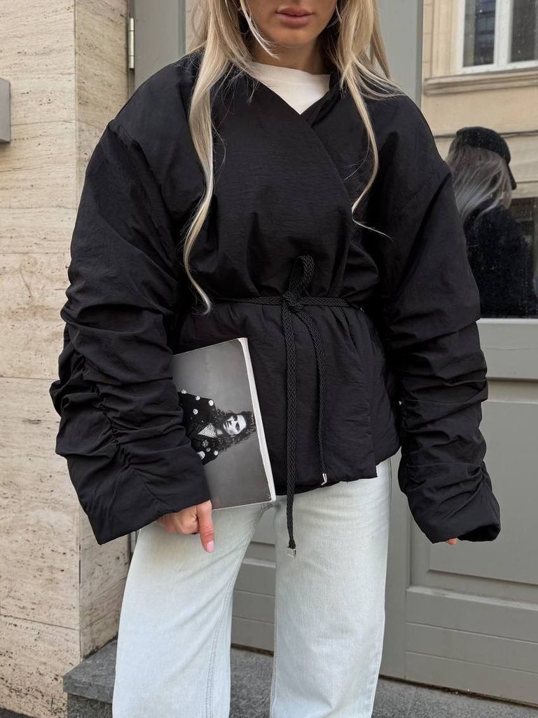 Чорна демісезонна коротка куртка кімоно виконана з плащівки-жатки на теплій підкладці з синтепону, що забезпечує комфортну температуру до 0°C. Модель має стильний крій на запах без застібки, доповнений тонким поясом-шнурком, який йде в комплекті. На рукавах драпірування, що додає легкості силуету. Кишені розташовані у бічних швах, довжина коротка — ідеально для сучасних образів у місті. Куртка добре виглядає як у прямому вільному вигляді, так і з акцентом на талії, створюючи елегантний та трендовий силует.