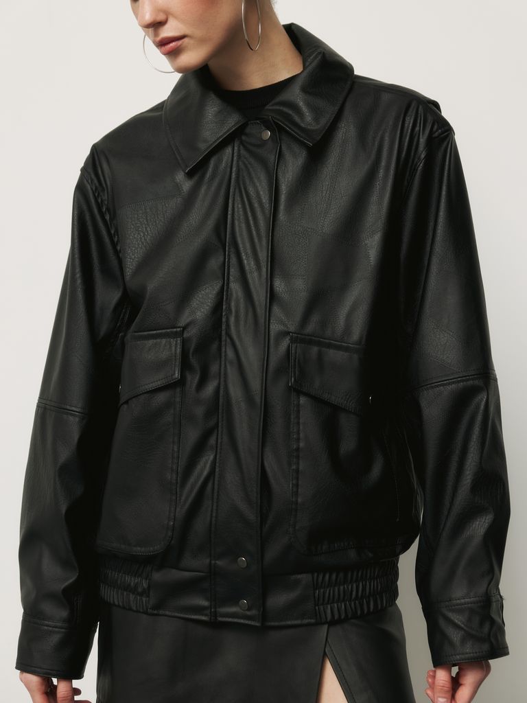 Найактуальніша модель шкіряної куртки, що прийшла на зміну базовим косухам. Виріб виконаний з високоякісного замінника шкіри, що ідеально імітує текстуру натурального матеріалу. Матеріал м'який, тому не утворює заломів. Неймовірно красива текстура. Куртка має відкладний комір, застібається металевою блискавкою високо під горло, що захищає від вітру та холоду. Посадка розслаблена, зі спущеними плечовими швами. Рукави зшиті з двох частин. На рівні локтей декоративний шов. Манжети сорочкового типу. Дві великі накладні кишені спереду. Низ куртки на гумці. Блискавка прикрита планкою зі шкіри та додатково застібається кнопками. Замовити та купити жіночу чорну шкіряну куртку у вінтажному стилі недорого можна в нас накладним платежем з передоплатою на доставку. Відправляємо в Київ, Дніпро, Житомир, Львів, Запоріжжя, Тернопіль, Одесу, Івано-Франківськ, Суми, Кропивницький, Полтаву, Черкаси та будь-який населений пункт України.