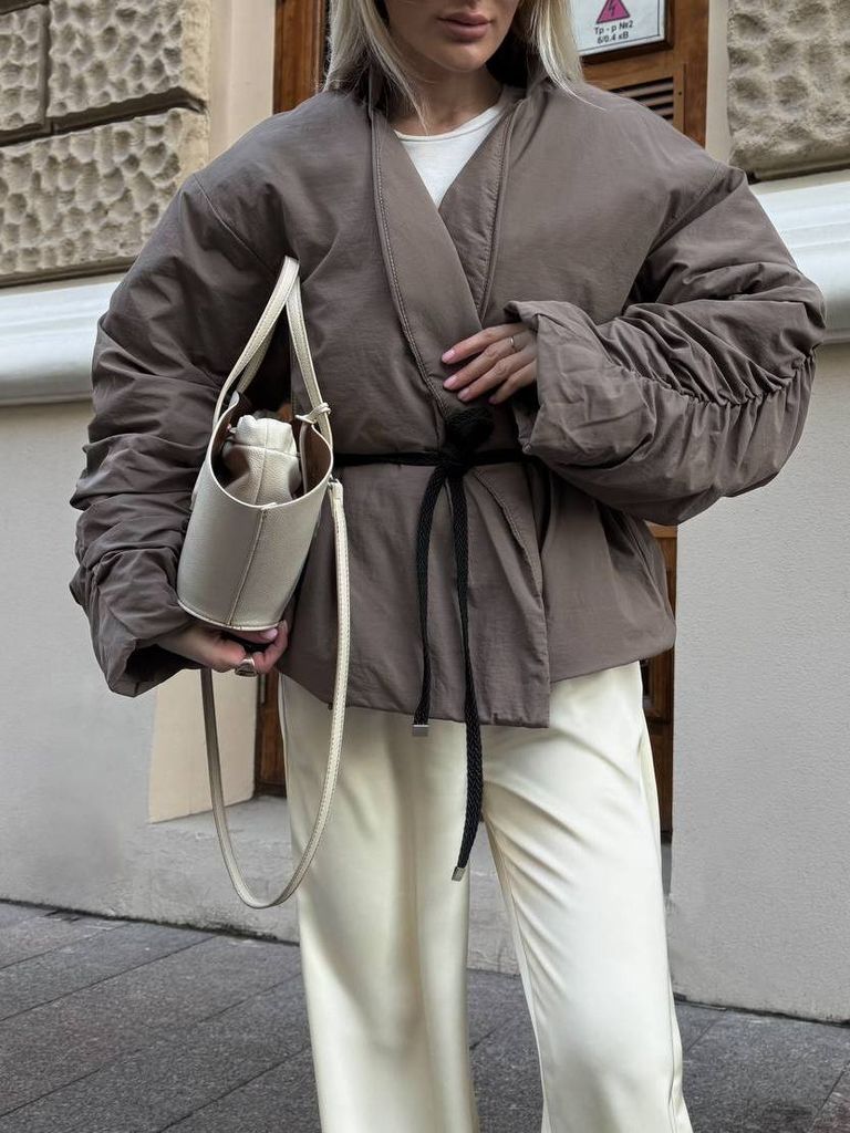 Демісезонна коротка куртка кімоно кольору мокко вирізняється вишуканим холодним відтінком, який чудово підходить для базових і складних стилізацій. Тканина плащівка-жатка на теплій підкладці з синтепону дозволяє комфортно носити куртку при температурі до 0°C. Крой кімоно на запах без застібки підкреслює легкість, а пояс-шнурок у комплекті допомагає створювати акцентовану талію. Драпірування на рукавах додає об’єму та стильності, бічні кишені забезпечують практичність. Коротка довжина робить модель зручною та універсальною для будь-якого образу.