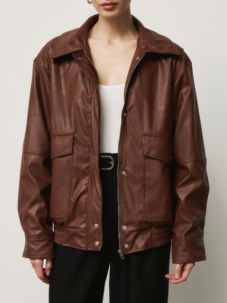 Стильна та зручна куртка шкірянка з високоякісної штучної шкіри. Текстура та м'якість матеріалу зумовлює натуральний вигляд та довгий строк носіння. Куртка вільної посадки. Плечові шви спущені. Комір англійський відкладний. Модель застібається металевою блискавкою та кнопками високо під шию. Є великі кишені накладного типу спереду. Низ куртки оброблений еластичним швом, що імітує гумку. Надзвичайно трендова та стильна модель для повсякденних образів. Замовити та купити жіночу коричневу шкіряну куртку у вінтажному стилі недорого можна в нас накладним платежем з передоплатою на доставку. Відправляємо в Київ, Дніпро, Житомир, Львів, Запоріжжя, Тернопіль, Одесу, Івано-Франківськ, Суми, Кропивницький, Полтаву, Черкаси та будь-який населений пункт України.