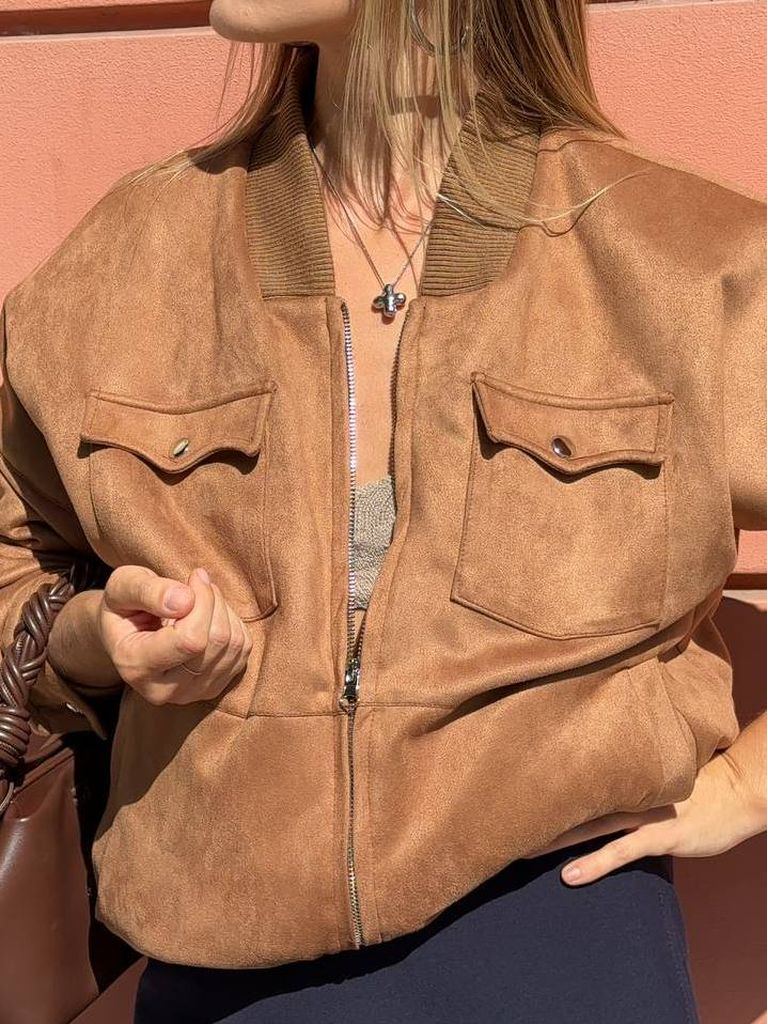 Коричневий замшевий бомбер на синтепоні — це стильний вибір, що поєднує в собі сучасний дизайн і практичність. Він має комір з в'язаної гумки в рубчик, що додає комфорту та допомагає зберігати тепло. Спереду на грудях є функціональні кишені на кнопках, що додають спортивної естетики. Бомбер застібається на металеву блискавку, а низ і манжети оформлені в'язаною резинкою для зручної посадки.