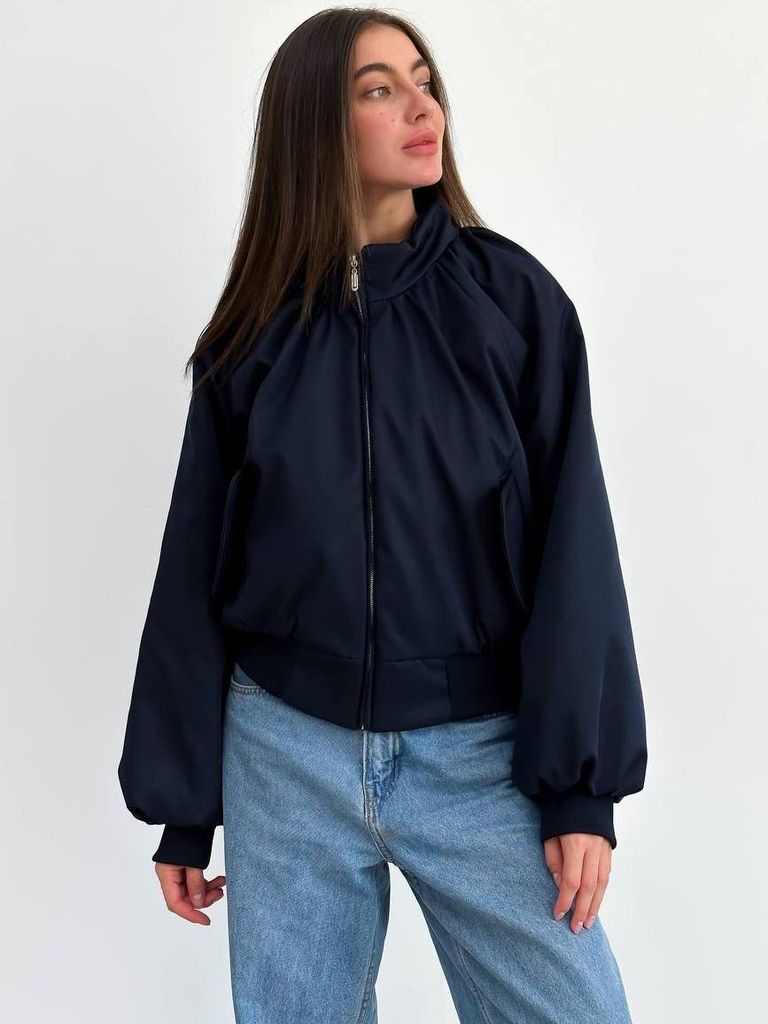 Зручний та практичний бомбер стандартної довжини. Рукави середнього об'єму. Посадка оверсайз. Застібається металевою акуратною блискавкою. Благородний темний синій колір гарно поєднується з різними відтінками деніму. Рукави з манжетами резинками. Кишені декоровані накладними клапанами. Горловина оформлена невисоким коміром стійкою, що захищає від вітру. Розрахований на теплу осінь-весну на плюсову температуру. Легкий та невагомий на тілі. Замовити та купити темно-синю жіночу куртку бомбер недорого можна в нас накладним платежем з передоплатою на доставку. Відправляємо в Київ, Дніпро, Житомир, Львів, Запоріжжя, Тернопіль, Одесу, Івано-Франківськ, Суми, Кропивницький, Полтаву, Черкаси та будь-який населений пункт України.