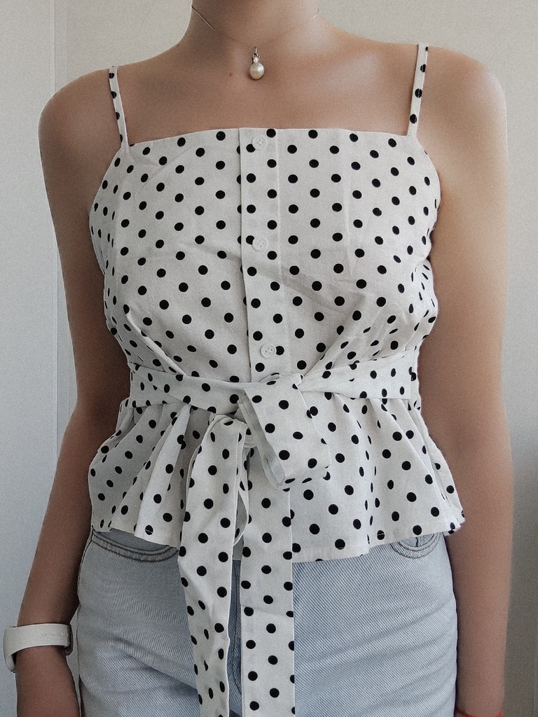 Базова біла майка з натуральної бавовни у білому кольорі. Кокетливий принт – дрібний чорний горошок. Модель із актуальним квадратним вирізом декольте, декорована ґудзиками спереду. Пояс пришитий, можна зав'язувати бант спереду або на спині. Цікавий крій.