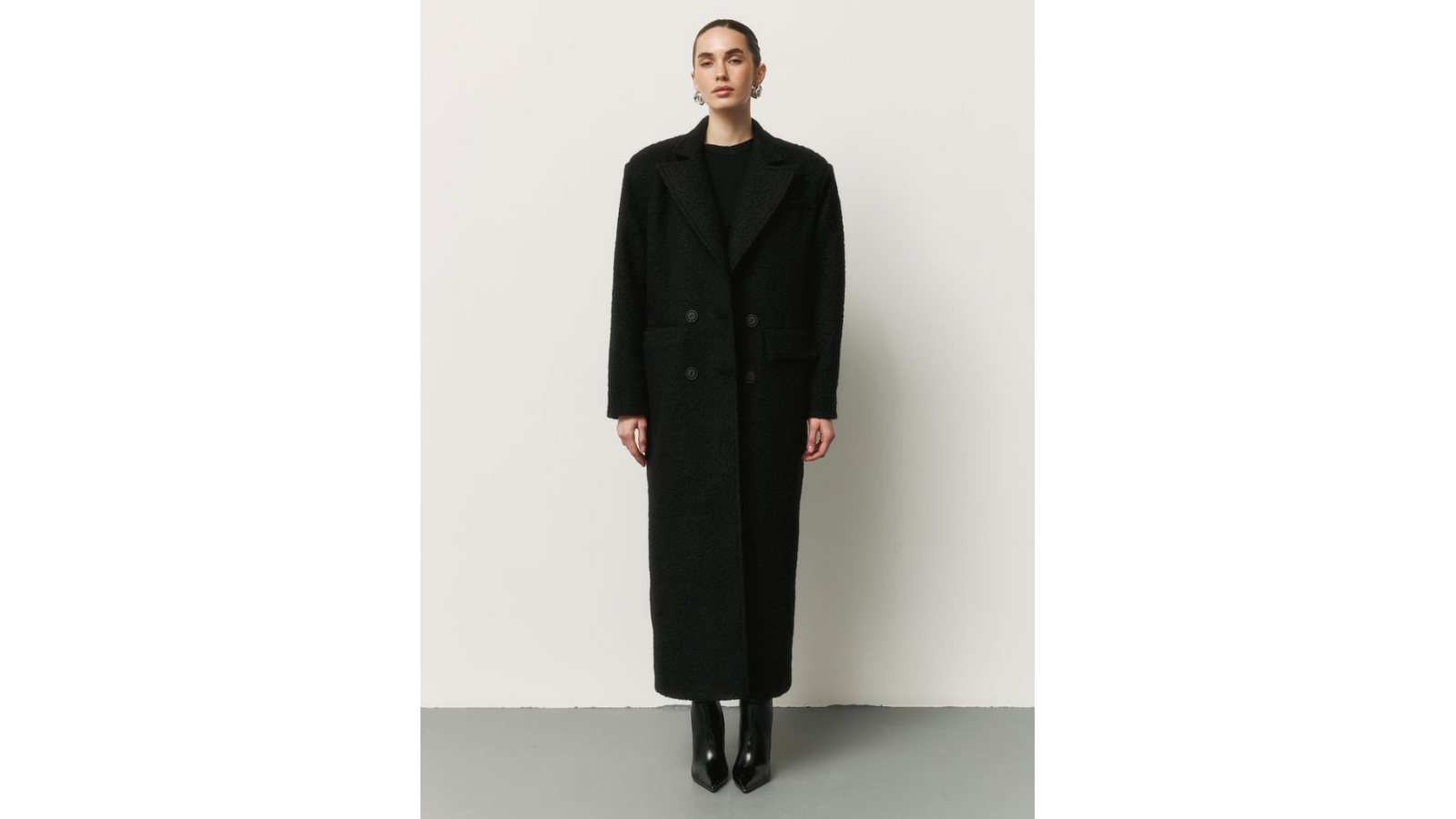 Стильне та вишукане пальто з акцентними плечима з шерстю в складі - ідеальний вибір на осінь та весну. За рахунок чорного кольору та лаконічного крою воно стане основою більшості образів, як повсякденних, так і елегантних ділових. Тканина має цікаву букльовану фактуру. Актуальний подовжений силует. Пальто застібається на ґудзики, що розміщені в 2 ряди, імітує двобортний фасон. Ззаду шліца, яка додає зручності під час ходіння. Комір відкладний. Є кишені. Крій прямий. Посадка розслаблена. Замовити та купити чорне довге пряме пальто з акцентними плечима недорого можна в нас накладним платежем з передоплатою на доставку. Відправляємо в Київ, Дніпро, Житомир, Львів, Запоріжжя, Тернопіль, Одесу, Івано-Франківськ, Суми, Кропивницький, Полтаву, Черкаси та будь-який населений пункт України.