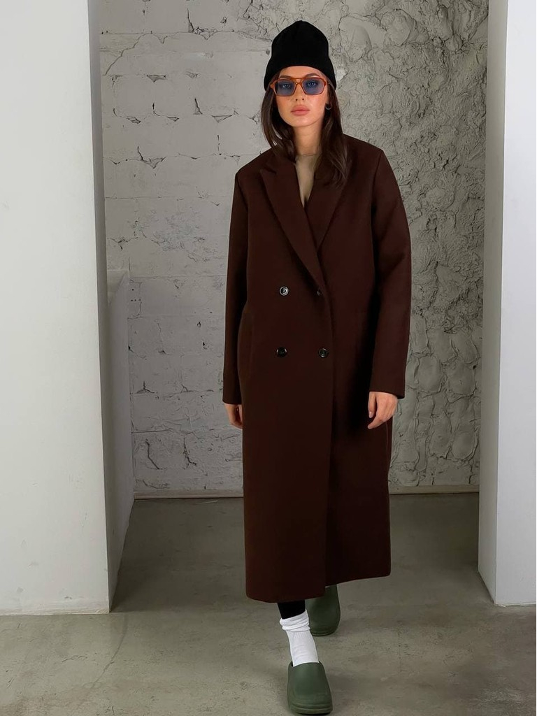 Неймовірно стильна модель прямого маскулінного крою в шикарному насиченому шоколадному кольорі. Модель двобортна, з англійським коміром. Рукави втачні. Довжина міді. Посадка розслаблена.