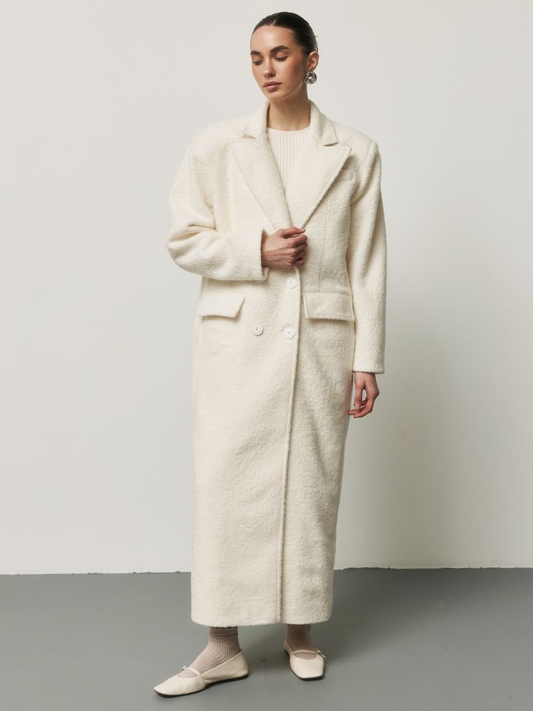 Вишукане демісезонне пальто в благородному молочному кольорі виконано з фактурної букльованої тканини. Завдяки шерсті в складі пальто підходить на більш холодну осінь та весну. Без додаткового утеплення. Актуальна максі довжина. Світлий колір додає свіжості. Зі спинки розпірка шліца. Ґудзики в 2 ряди. Відкладний комір з лаконічними прямими лініями додає образу структурованості. Є кишені. Головна фішка цього пальто - трендові акцентні плечі, що виводять аутфіт на якісно новий рівень. Завдяки акценту на плечах образ набуває маскулінності, тому жіноча фігура здається тендітною та стрункою. Замовити та купити молочне довге пряме пальто з акцентними плечима недорого можна в нас накладним платежем з передоплатою на доставку. Відправляємо в Київ, Дніпро, Житомир, Львів, Запоріжжя, Тернопіль, Одесу, Івано-Франківськ, Суми, Кропивницький, Полтаву, Черкаси та будь-який населений пункт України.